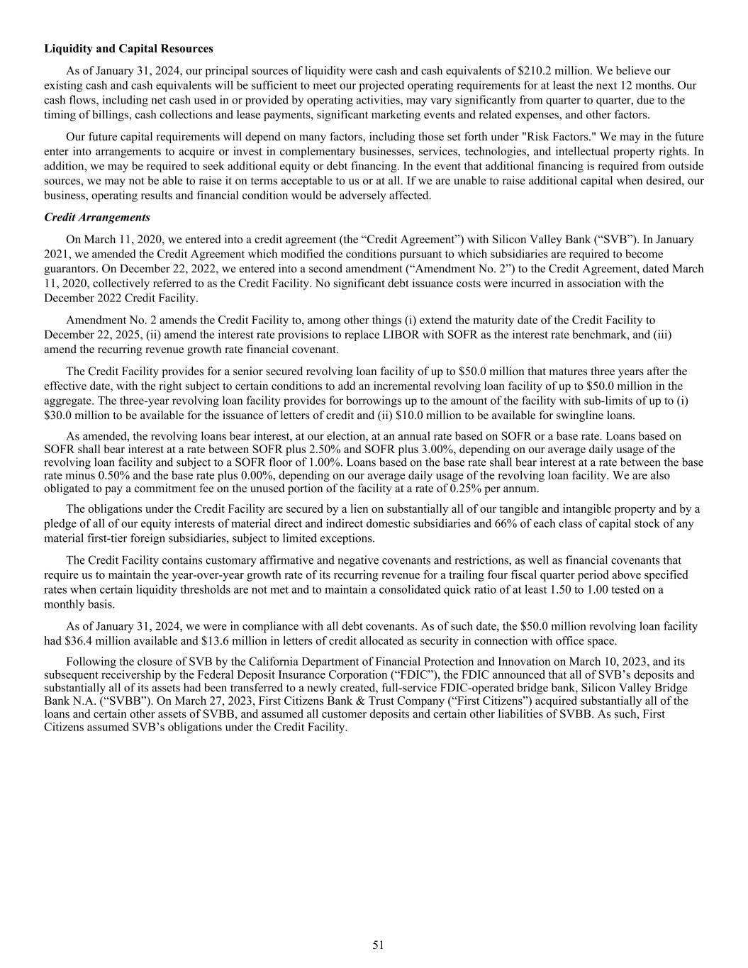 Liquidity and Capital Resources As of January 31, 2024, our principal sources of liquidity were cash and cash equivalents of $210.2 million. We believe our existing cash and cash equivalents will be sufficient to meet our projected operating requirements for at least the next 12 months. Our cash flows, including net cash used in or provided by operating activities, may vary significantly from quarter to quarter, due to the timing of billings, cash collections and lease payments, significant marketing events and related expenses, and other factors. Our future capital requirements will depend on many factors, including those set forth under "Risk Factors." We may in the future enter into arrangements to acquire or invest in complementary businesses, services, technologies, and intellectual property rights. In addition, we may be required to seek additional equity or debt financing. In the event that additional financing is required from outside sources, we may not be able to raise it on terms acceptable to us or at all. If we are unable to raise additional capital when desired, our business, operating results and financial condition would be adversely affected. Credit Arrangements On March 11, 2020, we entered into a credit agreement (the “Credit Agreement”) with Silicon Valley Bank (“SVB”). In January 2021, we amended the Credit Agreement which modified the conditions pursuant to which subsidiaries are required to become guarantors. On December 22, 2022, we entered into a second amendment (“Amendment No. 2”) to the Credit Agreement, dated March 11, 2020, collectively referred to as the Credit Facility. No significant debt issuance costs were incurred in association with the December 2022 Credit Facility. Amendment No. 2 amends the Credit Facility to, among other things (i) extend the maturity date of the Credit Facility to December 22, 2025, (ii) amend the interest rate provisions to replace LIBOR with SOFR as the interest rate benchmark, and (iii) amend the recurring revenue growth rate financial covenant. The Credit Facility provides for a senior secured revolving loan facility of up to $50.0 million that matures three years after the effective date, with the right subject to certain conditions to add an incremental revolving loan facility of up to $50.0 million in the aggregate. The three-year revolving loan facility provides for borrowings up to the amount of the facility with sub-limits of up to (i) $30.0 million to be available for the issuance of letters of credit and (ii) $10.0 million to be available for swingline loans. As amended, the revolving loans bear interest, at our election, at an annual rate based on SOFR or a base rate. Loans based on SOFR shall bear interest at a rate between SOFR plus 2.50% and SOFR plus 3.00%, depending on our average daily usage of the revolving loan facility and subject to a SOFR floor of 1.00%. Loans based on the base rate shall bear interest at a rate between the base rate minus 0.50% and the base rate plus 0.00%, depending on our average daily usage of the revolving loan facility. We are also obligated to pay a commitment fee on the unused portion of the facility at a rate of 0.25% per annum. The obligations under the Credit Facility are secured by a lien on substantially all of our tangible and intangible property and by a pledge of all of our equity interests of material direct and indirect domestic subsidiaries and 66% of each class of capital stock of any material first-tier foreign subsidiaries, subject to limited exceptions. The Credit Facility contains customary affirmative and negative covenants and restrictions, as well as financial covenants that require us to maintain the year-over-year growth rate of its recurring revenue for a trailing four fiscal quarter period above specified rates when certain liquidity thresholds are not met and to maintain a consolidated quick ratio of at least 1.50 to 1.00 tested on a monthly basis. As of January 31, 2024, we were in compliance with all debt covenants. As of such date, the $50.0 million revolving loan facility had $36.4 million available and $13.6 million in letters of credit allocated as security in connection with office space. Following the closure of SVB by the California Department of Financial Protection and Innovation on March 10, 2023, and its subsequent receivership by the Federal Deposit Insurance Corporation (“FDIC”), the FDIC announced that all of SVB’s deposits and substantially all of its assets had been transferred to a newly created, full-service FDIC-operated bridge bank, Silicon Valley Bridge Bank N.A. (“SVBB”). On March 27, 2023, First Citizens Bank & Trust Company (“First Citizens”) acquired substantially all of the loans and certain other assets of SVBB, and assumed all customer deposits and certain other liabilities of SVBB. As such, First Citizens assumed SVB’s obligations under the Credit Facility. 51