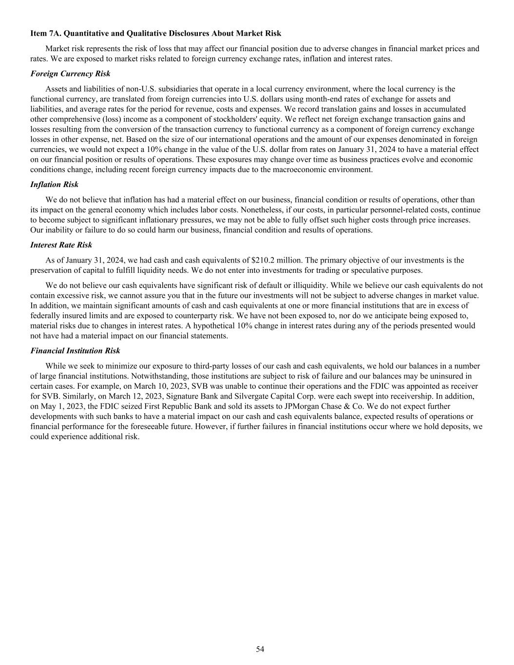 Item 7A. Quantitative and Qualitative Disclosures About Market Risk Market risk represents the risk of loss that may affect our financial position due to adverse changes in financial market prices and rates. We are exposed to market risks related to foreign currency exchange rates, inflation and interest rates. Foreign Currency Risk Assets and liabilities of non-U.S. subsidiaries that operate in a local currency environment, where the local currency is the functional currency, are translated from foreign currencies into U.S. dollars using month-end rates of exchange for assets and liabilities, and average rates for the period for revenue, costs and expenses. We record translation gains and losses in accumulated other comprehensive (loss) income as a component of stockholders' equity. We reflect net foreign exchange transaction gains and losses resulting from the conversion of the transaction currency to functional currency as a component of foreign currency exchange losses in other expense, net. Based on the size of our international operations and the amount of our expenses denominated in foreign currencies, we would not expect a 10% change in the value of the U.S. dollar from rates on January 31, 2024 to have a material effect on our financial position or results of operations. These exposures may change over time as business practices evolve and economic conditions change, including recent foreign currency impacts due to the macroeconomic environment. Inflation Risk We do not believe that inflation has had a material effect on our business, financial condition or results of operations, other than its impact on the general economy which includes labor costs. Nonetheless, if our costs, in particular personnel-related costs, continue to become subject to significant inflationary pressures, we may not be able to fully offset such higher costs through price increases. Our inability or failure to do so could harm our business, financial condition and results of operations. Interest Rate Risk As of January 31, 2024, we had cash and cash equivalents of $210.2 million. The primary objective of our investments is the preservation of capital to fulfill liquidity needs. We do not enter into investments for trading or speculative purposes. We do not believe our cash equivalents have significant risk of default or illiquidity. While we believe our cash equivalents do not contain excessive risk, we cannot assure you that in the future our investments will not be subject to adverse changes in market value. In addition, we maintain significant amounts of cash and cash equivalents at one or more financial institutions that are in excess of federally insured limits and are exposed to counterparty risk. We have not been exposed to, nor do we anticipate being exposed to, material risks due to changes in interest rates. A hypothetical 10% change in interest rates during any of the periods presented would not have had a material impact on our financial statements. Financial Institution Risk While we seek to minimize our exposure to third-party losses of our cash and cash equivalents, we hold our balances in a number of large financial institutions. Notwithstanding, those institutions are subject to risk of failure and our balances may be uninsured in certain cases. For example, on March 10, 2023, SVB was unable to continue their operations and the FDIC was appointed as receiver for SVB. Similarly, on March 12, 2023, Signature Bank and Silvergate Capital Corp. were each swept into receivership. In addition, on May 1, 2023, the FDIC seized First Republic Bank and sold its assets to JPMorgan Chase & Co. We do not expect further developments with such banks to have a material impact on our cash and cash equivalents balance, expected results of operations or financial performance for the foreseeable future. However, if further failures in financial institutions occur where we hold deposits, we could experience additional risk. 54