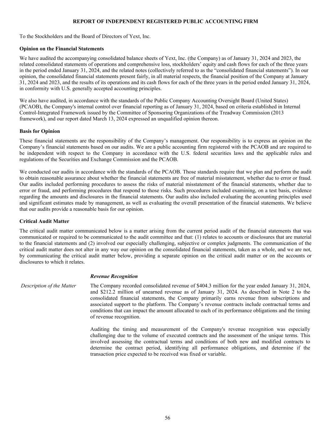 REPORT OF INDEPENDENT REGISTERED PUBLIC ACCOUNTING FIRM To the Stockholders and the Board of Directors of Yext, Inc. Opinion on the Financial Statements We have audited the accompanying consolidated balance sheets of Yext, Inc. (the Company) as of January 31, 2024 and 2023, the related consolidated statements of operations and comprehensive loss, stockholders’ equity and cash flows for each of the three years in the period ended January 31, 2024, and the related notes (collectively referred to as the “consolidated financial statements”). In our opinion, the consolidated financial statements present fairly, in all material respects, the financial position of the Company at January 31, 2024 and 2023, and the results of its operations and its cash flows for each of the three years in the period ended January 31, 2024, in conformity with U.S. generally accepted accounting principles. We also have audited, in accordance with the standards of the Public Company Accounting Oversight Board (United States) (PCAOB), the Company's internal control over financial reporting as of January 31, 2024, based on criteria established in Internal Control-Integrated Framework issued by the Committee of Sponsoring Organizations of the Treadway Commission (2013 framework), and our report dated March 13, 2024 expressed an unqualified opinion thereon. Basis for Opinion These financial statements are the responsibility of the Company’s management. Our responsibility is to express an opinion on the Company’s financial statements based on our audits. We are a public accounting firm registered with the PCAOB and are required to be independent with respect to the Company in accordance with the U.S. federal securities laws and the applicable rules and regulations of the Securities and Exchange Commission and the PCAOB. We conducted our audits in accordance with the standards of the PCAOB. Those standards require that we plan and perform the audit to obtain reasonable assurance about whether the financial statements are free of material misstatement, whether due to error or fraud. Our audits included performing procedures to assess the risks of material misstatement of the financial statements, whether due to error or fraud, and performing procedures that respond to those risks. Such procedures included examining, on a test basis, evidence regarding the amounts and disclosures in the financial statements. Our audits also included evaluating the accounting principles used and significant estimates made by management, as well as evaluating the overall presentation of the financial statements. We believe that our audits provide a reasonable basis for our opinion. Critical Audit Matter The critical audit matter communicated below is a matter arising from the current period audit of the financial statements that was communicated or required to be communicated to the audit committee and that: (1) relates to accounts or disclosures that are material to the financial statements and (2) involved our especially challenging, subjective or complex judgments. The communication of the critical audit matter does not alter in any way our opinion on the consolidated financial statements, taken as a whole, and we are not, by communicating the critical audit matter below, providing a separate opinion on the critical audit matter or on the accounts or disclosures to which it relates. Revenue Recognition Description of the Matter The Company recorded consolidated revenue of $404.3 million for the year ended January 31, 2024, and $212.2 million of unearned revenue as of January 31, 2024. As described in Note 2 to the consolidated financial statements, the Company primarily earns revenue from subscriptions and associated support to the platform. The Company’s revenue contracts include contractual terms and conditions that can impact the amount allocated to each of its performance obligations and the timing of revenue recognition. Auditing the timing and measurement of the Company's revenue recognition was especially challenging due to the volume of executed contracts and the assessment of the unique terms. This involved assessing the contractual terms and conditions of both new and modified contracts to determine the contract period, identifying all performance obligations, and determine if the transaction price expected to be received was fixed or variable. 56