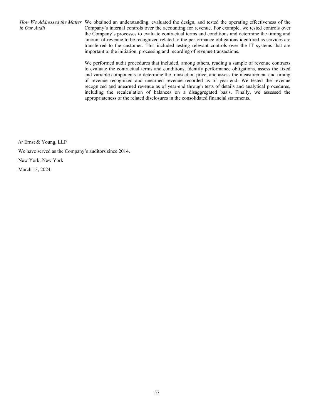 How We Addressed the Matter in Our Audit We obtained an understanding, evaluated the design, and tested the operating effectiveness of the Company’s internal controls over the accounting for revenue. For example, we tested controls over the Company’s processes to evaluate contractual terms and conditions and determine the timing and amount of revenue to be recognized related to the performance obligations identified as services are transferred to the customer. This included testing relevant controls over the IT systems that are important to the initiation, processing and recording of revenue transactions. We performed audit procedures that included, among others, reading a sample of revenue contracts to evaluate the contractual terms and conditions, identify performance obligations, assess the fixed and variable components to determine the transaction price, and assess the measurement and timing of revenue recognized and unearned revenue recorded as of year-end. We tested the revenue recognized and unearned revenue as of year-end through tests of details and analytical procedures, including the recalculation of balances on a disaggregated basis. Finally, we assessed the appropriateness of the related disclosures in the consolidated financial statements. /s/ Ernst & Young, LLP We have served as the Company’s auditors since 2014. New York, New York March 13, 2024 57