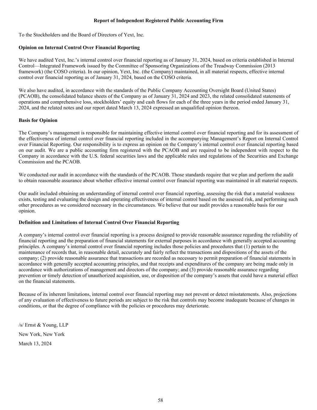 Report of Independent Registered Public Accounting Firm To the Stockholders and the Board of Directors of Yext, Inc. Opinion on Internal Control Over Financial Reporting We have audited Yext, Inc.’s internal control over financial reporting as of January 31, 2024, based on criteria established in Internal Control—Integrated Framework issued by the Committee of Sponsoring Organizations of the Treadway Commission (2013 framework) (the COSO criteria). In our opinion, Yext, Inc. (the Company) maintained, in all material respects, effective internal control over financial reporting as of January 31, 2024, based on the COSO criteria. We also have audited, in accordance with the standards of the Public Company Accounting Oversight Board (United States) (PCAOB), the consolidated balance sheets of the Company as of January 31, 2024 and 2023, the related consolidated statements of operations and comprehensive loss, stockholders’ equity and cash flows for each of the three years in the period ended January 31, 2024, and the related notes and our report dated March 13, 2024 expressed an unqualified opinion thereon. Basis for Opinion The Company’s management is responsible for maintaining effective internal control over financial reporting and for its assessment of the effectiveness of internal control over financial reporting included in the accompanying Management’s Report on Internal Control over Financial Reporting. Our responsibility is to express an opinion on the Company’s internal control over financial reporting based on our audit. We are a public accounting firm registered with the PCAOB and are required to be independent with respect to the Company in accordance with the U.S. federal securities laws and the applicable rules and regulations of the Securities and Exchange Commission and the PCAOB. We conducted our audit in accordance with the standards of the PCAOB. Those standards require that we plan and perform the audit to obtain reasonable assurance about whether effective internal control over financial reporting was maintained in all material respects. Our audit included obtaining an understanding of internal control over financial reporting, assessing the risk that a material weakness exists, testing and evaluating the design and operating effectiveness of internal control based on the assessed risk, and performing such other procedures as we considered necessary in the circumstances. We believe that our audit provides a reasonable basis for our opinion. Definition and Limitations of Internal Control Over Financial Reporting A company’s internal control over financial reporting is a process designed to provide reasonable assurance regarding the reliability of financial reporting and the preparation of financial statements for external purposes in accordance with generally accepted accounting principles. A company’s internal control over financial reporting includes those policies and procedures that (1) pertain to the maintenance of records that, in reasonable detail, accurately and fairly reflect the transactions and dispositions of the assets of the company; (2) provide reasonable assurance that transactions are recorded as necessary to permit preparation of financial statements in accordance with generally accepted accounting principles, and that receipts and expenditures of the company are being made only in accordance with authorizations of management and directors of the company; and (3) provide reasonable assurance regarding prevention or timely detection of unauthorized acquisition, use, or disposition of the company’s assets that could have a material effect on the financial statements. Because of its inherent limitations, internal control over financial reporting may not prevent or detect misstatements. Also, projections of any evaluation of effectiveness to future periods are subject to the risk that controls may become inadequate because of changes in conditions, or that the degree of compliance with the policies or procedures may deteriorate. /s/ Ernst & Young, LLP New York, New York March 13, 2024 58