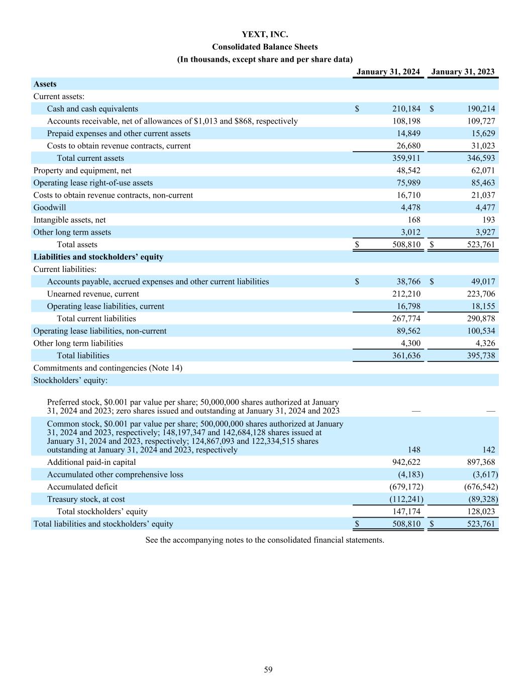 YEXT, INC. Consolidated Balance Sheets (In thousands, except share and per share data) January 31, 2024 January 31, 2023 Assets Current assets: Cash and cash equivalents $ 210,184 $ 190,214 Accounts receivable, net of allowances of $1,013 and $868, respectively 108,198 109,727 Prepaid expenses and other current assets 14,849 15,629 Costs to obtain revenue contracts, current 26,680 31,023 Total current assets 359,911 346,593 Property and equipment, net 48,542 62,071 Operating lease right-of-use assets 75,989 85,463 Costs to obtain revenue contracts, non-current 16,710 21,037 Goodwill 4,478 4,477 Intangible assets, net 168 193 Other long term assets 3,012 3,927 Total assets $ 508,810 $ 523,761 Liabilities and stockholders’ equity Current liabilities: Accounts payable, accrued expenses and other current liabilities $ 38,766 $ 49,017 Unearned revenue, current 212,210 223,706 Operating lease liabilities, current 16,798 18,155 Total current liabilities 267,774 290,878 Operating lease liabilities, non-current 89,562 100,534 Other long term liabilities 4,300 4,326 Total liabilities 361,636 395,738 Commitments and contingencies (Note 14) Stockholders’ equity: Preferred stock, $0.001 par value per share; 50,000,000 shares authorized at January 31, 2024 and 2023; zero shares issued and outstanding at January 31, 2024 and 2023 — — Common stock, $0.001 par value per share; 500,000,000 shares authorized at January 31, 2024 and 2023, respectively; 148,197,347 and 142,684,128 shares issued at January 31, 2024 and 2023, respectively; 124,867,093 and 122,334,515 shares outstanding at January 31, 2024 and 2023, respectively 148 142 Additional paid-in capital 942,622 897,368 Accumulated other comprehensive loss (4,183) (3,617) Accumulated deficit (679,172) (676,542) Treasury stock, at cost (112,241) (89,328) Total stockholders’ equity 147,174 128,023 Total liabilities and stockholders’ equity $ 508,810 $ 523,761 See the accompanying notes to the consolidated financial statements. 59
