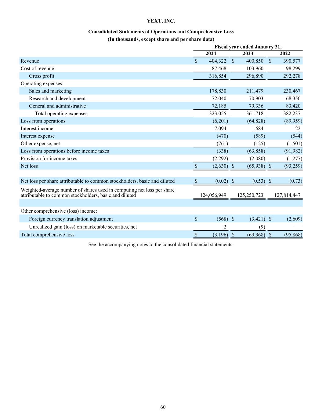 YEXT, INC. Consolidated Statements of Operations and Comprehensive Loss (In thousands, except share and per share data) 2024 2023 2022 Revenue $ 404,322 $ 400,850 $ 390,577 Cost of revenue 87,468 103,960 98,299 Gross profit 316,854 296,890 292,278 Operating expenses: Sales and marketing 178,830 211,479 230,467 Research and development 72,040 70,903 68,350 General and administrative 72,185 79,336 83,420 Total operating expenses 323,055 361,718 382,237 Loss from operations (6,201) (64,828) (89,959) Interest income 7,094 1,684 22 Interest expense (470) (589) (544) Other expense, net (761) (125) (1,501) Loss from operations before income taxes (338) (63,858) (91,982) Provision for income taxes (2,292) (2,080) (1,277) Net loss $ (2,630) $ (65,938) $ (93,259) Net loss per share attributable to common stockholders, basic and diluted $ (0.02) $ (0.53) $ (0.73) Weighted-average number of shares used in computing net loss per share attributable to common stockholders, basic and diluted 124,056,949 125,250,723 127,814,447 Other comprehensive (loss) income: Foreign currency translation adjustment $ (568) $ (3,421) $ (2,609) Unrealized gain (loss) on marketable securities, net 2 (9) — Total comprehensive loss $ (3,196) $ (69,368) $ (95,868) Fiscal year ended January 31, See the accompanying notes to the consolidated financial statements. 60
