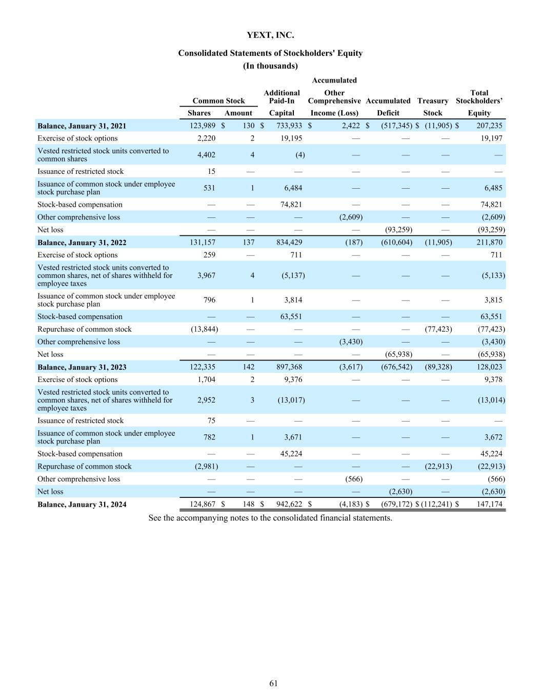 YEXT, INC. Consolidated Statements of Stockholders' Equity (In thousands) Accumulated Common Stock Additional Paid-In Other Comprehensive Accumulated Treasury Total Stockholders’ Shares Amount Capital Income (Loss) Deficit Stock Equity Balance, January 31, 2021 123,989 $ 130 $ 733,933 $ 2,422 $ (517,345) $ (11,905) $ 207,235 Exercise of stock options 2,220 2 19,195 — — — 19,197 Vested restricted stock units converted to common shares 4,402 4 (4) — — — — Issuance of restricted stock 15 — — — — — — Issuance of common stock under employee stock purchase plan 531 1 6,484 — — — 6,485 Stock-based compensation — — 74,821 — — — 74,821 Other comprehensive loss — — — (2,609) — — (2,609) Net loss — — — — (93,259) — (93,259) Balance, January 31, 2022 131,157 137 834,429 (187) (610,604) (11,905) 211,870 Exercise of stock options 259 — 711 — — — 711 Vested restricted stock units converted to common shares, net of shares withheld for employee taxes 3,967 4 (5,137) — — — (5,133) Issuance of common stock under employee stock purchase plan 796 1 3,814 — — — 3,815 Stock-based compensation — — 63,551 — — — 63,551 Repurchase of common stock (13,844) — — — — (77,423) (77,423) Other comprehensive loss — — — (3,430) — — (3,430) Net loss — — — — (65,938) — (65,938) Balance, January 31, 2023 122,335 142 897,368 (3,617) (676,542) (89,328) 128,023 Exercise of stock options 1,704 2 9,376 — — — 9,378 Vested restricted stock units converted to common shares, net of shares withheld for employee taxes 2,952 3 (13,017) — — — (13,014) Issuance of restricted stock 75 — — — — — — Issuance of common stock under employee stock purchase plan 782 1 3,671 — — — 3,672 Stock-based compensation — — 45,224 — — — 45,224 Repurchase of common stock (2,981) — — — — (22,913) (22,913) Other comprehensive loss — — — (566) — — (566) Net loss — — — — (2,630) — (2,630) Balance, January 31, 2024 124,867 $ 148 $ 942,622 $ (4,183) $ (679,172) $ (112,241) $ 147,174 See the accompanying notes to the consolidated financial statements. 61