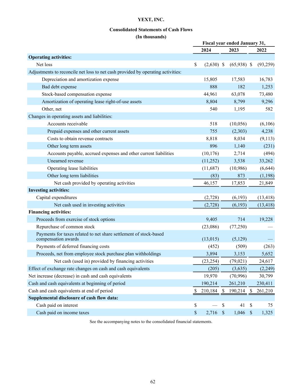 YEXT, INC. Consolidated Statements of Cash Flows (In thousands) 2024 2023 2022 Operating activities: Net loss $ (2,630) $ (65,938) $ (93,259) Adjustments to reconcile net loss to net cash provided by operating activities: Depreciation and amortization expense 15,805 17,583 16,783 Bad debt expense 888 182 1,253 Stock-based compensation expense 44,961 63,078 73,480 Amortization of operating lease right-of-use assets 8,804 8,799 9,296 Other, net 540 1,195 582 Changes in operating assets and liabilities: Accounts receivable 518 (10,056) (6,106) Prepaid expenses and other current assets 755 (2,303) 4,238 Costs to obtain revenue contracts 8,818 8,034 (9,113) Other long term assets 896 1,140 (231) Accounts payable, accrued expenses and other current liabilities (10,176) 2,714 (494) Unearned revenue (11,252) 3,538 33,262 Operating lease liabilities (11,687) (10,986) (6,644) Other long term liabilities (83) 873 (1,198) Net cash provided by operating activities 46,157 17,853 21,849 Investing activities: Capital expenditures (2,728) (6,193) (13,418) Net cash used in investing activities (2,728) (6,193) (13,418) Financing activities: Proceeds from exercise of stock options 9,405 714 19,228 Repurchase of common stock (23,086) (77,250) — Payments for taxes related to net share settlement of stock-based compensation awards (13,015) (5,129) — Payments of deferred financing costs (452) (509) (263) Proceeds, net from employee stock purchase plan withholdings 3,894 3,153 5,652 Net cash (used in) provided by financing activities (23,254) (79,021) 24,617 Effect of exchange rate changes on cash and cash equivalents (205) (3,635) (2,249) Net increase (decrease) in cash and cash equivalents 19,970 (70,996) 30,799 Cash and cash equivalents at beginning of period 190,214 261,210 230,411 Cash and cash equivalents at end of period $ 210,184 $ 190,214 $ 261,210 Supplemental disclosure of cash flow data: Cash paid on interest $ — $ 41 $ 75 Cash paid on income taxes $ 2,716 $ 1,046 $ 1,325 Fiscal year ended January 31, See the accompanying notes to the consolidated financial statements. 62