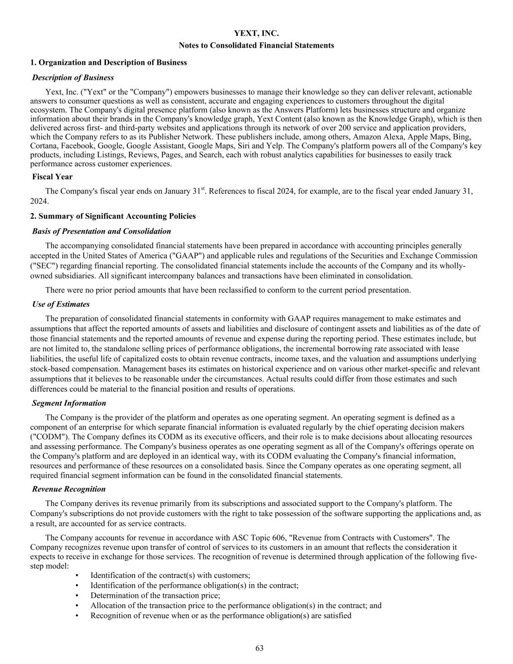 YEXT, INC. Notes to Consolidated Financial Statements 1. Organization and Description of Business Description of Business Yext, Inc. ("Yext" or the "Company") empowers businesses to manage their knowledge so they can deliver relevant, actionable answers to consumer questions as well as consistent, accurate and engaging experiences to customers throughout the digital ecosystem. The Company's digital presence platform (also known as the Answers Platform) lets businesses structure and organize information about their brands in the Company's knowledge graph, Yext Content (also known as the Knowledge Graph), which is then delivered across first- and third-party websites and applications through its network of over 200 service and application providers, which the Company refers to as its Publisher Network. These publishers include, among others, Amazon Alexa, Apple Maps, Bing, Cortana, Facebook, Google, Google Assistant, Google Maps, Siri and Yelp. The Company's platform powers all of the Company's key products, including Listings, Reviews, Pages, and Search, each with robust analytics capabilities for businesses to easily track performance across customer experiences. Fiscal Year The Company's fiscal year ends on January 31st. References to fiscal 2024, for example, are to the fiscal year ended January 31, 2024. 2. Summary of Significant Accounting Policies Basis of Presentation and Consolidation The accompanying consolidated financial statements have been prepared in accordance with accounting principles generally accepted in the United States of America ("GAAP") and applicable rules and regulations of the Securities and Exchange Commission ("SEC") regarding financial reporting. The consolidated financial statements include the accounts of the Company and its wholly- owned subsidiaries. All significant intercompany balances and transactions have been eliminated in consolidation. There were no prior period amounts that have been reclassified to conform to the current period presentation. Use of Estimates The preparation of consolidated financial statements in conformity with GAAP requires management to make estimates and assumptions that affect the reported amounts of assets and liabilities and disclosure of contingent assets and liabilities as of the date of those financial statements and the reported amounts of revenue and expense during the reporting period. These estimates include, but are not limited to, the standalone selling prices of performance obligations, the incremental borrowing rate associated with lease liabilities, the useful life of capitalized costs to obtain revenue contracts, income taxes, and the valuation and assumptions underlying stock-based compensation. Management bases its estimates on historical experience and on various other market-specific and relevant assumptions that it believes to be reasonable under the circumstances. Actual results could differ from those estimates and such differences could be material to the financial position and results of operations. Segment Information The Company is the provider of the platform and operates as one operating segment. An operating segment is defined as a component of an enterprise for which separate financial information is evaluated regularly by the chief operating decision makers ("CODM"). The Company defines its CODM as its executive officers, and their role is to make decisions about allocating resources and assessing performance. The Company's business operates as one operating segment as all of the Company's offerings operate on the Company's platform and are deployed in an identical way, with its CODM evaluating the Company's financial information, resources and performance of these resources on a consolidated basis. Since the Company operates as one operating segment, all required financial segment information can be found in the consolidated financial statements. Revenue Recognition The Company derives its revenue primarily from its subscriptions and associated support to the Company's platform. The Company's subscriptions do not provide customers with the right to take possession of the software supporting the applications and, as a result, are accounted for as service contracts. The Company accounts for revenue in accordance with ASC Topic 606, "Revenue from Contracts with Customers". The Company recognizes revenue upon transfer of control of services to its customers in an amount that reflects the consideration it expects to receive in exchange for those services. The recognition of revenue is determined through application of the following five- step model: • Identification of the contract(s) with customers; • Identification of the performance obligation(s) in the contract; • Determination of the transaction price; • Allocation of the transaction price to the performance obligation(s) in the contract; and • Recognition of revenue when or as the performance obligation(s) are satisfied 63