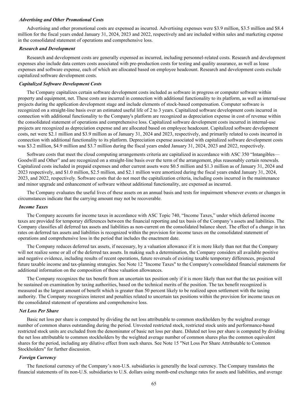 Advertising and Other Promotional Costs Advertising and other promotional costs are expensed as incurred. Advertising expenses were $3.9 million, $3.5 million and $8.4 million for the fiscal years ended January 31, 2024, 2023 and 2022, respectively and are included within sales and marketing expense in the consolidated statement of operations and comprehensive loss. Research and Development Research and development costs are generally expensed as incurred, including personnel-related costs. Research and development expenses also include data centers costs associated with pre-production costs for testing and quality assurance, as well as lease expenses and software expense, each of which are allocated based on employee headcount. Research and development costs exclude capitalized software development costs. Capitalized Software Development Costs The Company capitalizes certain software development costs included as software in progress or computer software within property and equipment, net. These costs are incurred in connection with additional functionality to its platform, as well as internal-use projects during the application development stage and include elements of stock-based compensation. Computer software is recognized on a straight-line basis over an estimated useful life of 2 to 3 years. Capitalized software development costs incurred in connection with additional functionality to the Company's platform are recognized as depreciation expense in cost of revenue within the consolidated statement of operations and comprehensive loss. Capitalized software development costs incurred in internal-use projects are recognized as depreciation expense and are allocated based on employee headcount. Capitalized software development costs, net were $2.1 million and $3.9 million as of January 31, 2024 and 2023, respectively, and primarily related to costs incurred in connection with additional functionality to its platform. Depreciation expense associated with capitalized software development costs was $3.2 million, $4.9 million and $3.7 million during the fiscal years ended January 31, 2024, 2023 and 2022, respectively. Software costs that meet the cloud computing arrangements criteria are capitalized in accordance with ASC 350 “Intangibles— Goodwill and Other” and are recognized on a straight-line basis over the term of the arrangement, plus reasonably certain renewals. Capitalized costs included in prepaid expenses and other current assets were $0.5 million and $1.3 million as of January 31, 2024 and 2023 respectively, and $1.0 million, $2.5 million, and $2.1 million were amortized during the fiscal years ended January 31, 2024, 2023, and 2022, respectively. Software costs that do not meet the capitalization criteria, including costs incurred in the maintenance and minor upgrade and enhancement of software without additional functionality, are expensed as incurred. The Company evaluates the useful lives of these assets on an annual basis and tests for impairment whenever events or changes in circumstances indicate that the carrying amount may not be recoverable. Income Taxes The Company accounts for income taxes in accordance with ASC Topic 740, “Income Taxes,” under which deferred income taxes are provided for temporary differences between the financial reporting and tax basis of the Company’s assets and liabilities. The Company classifies all deferred tax assets and liabilities as non-current on the consolidated balance sheet. The effect of a change in tax rates on deferred tax assets and liabilities is recognized within the provision for income taxes on the consolidated statement of operations and comprehensive loss in the period that includes the enactment date. The Company reduces deferred tax assets, if necessary, by a valuation allowance if it is more likely than not that the Company will not realize some or all of the deferred tax assets. In making such a determination, the Company considers all available positive and negative evidence, including results of recent operations, future reversals of existing taxable temporary differences, projected future taxable income and tax-planning strategies. See Note 12 "Income Taxes" to the Company's consolidated financial statements for additional information on the composition of these valuation allowances. The Company recognizes the tax benefit from an uncertain tax position only if it is more likely than not that the tax position will be sustained on examination by taxing authorities, based on the technical merits of the position. The tax benefit recognized is measured as the largest amount of benefit which is greater than 50 percent likely to be realized upon settlement with the taxing authority. The Company recognizes interest and penalties related to uncertain tax positions within the provision for income taxes on the consolidated statement of operations and comprehensive loss. Net Loss Per Share Basic net loss per share is computed by dividing the net loss attributable to common stockholders by the weighted average number of common shares outstanding during the period. Unvested restricted stock, restricted stock units and performance-based restricted stock units are excluded from the denominator of basic net loss per share. Diluted net loss per share is computed by dividing the net loss attributable to common stockholders by the weighted average number of common shares plus the common equivalent shares for the period, including any dilutive effect from such shares. See Note 15 "Net Loss Per Share Attributable to Common Stockholders" for further discussion. Foreign Currency The functional currency of the Company’s non-U.S. subsidiaries is generally the local currency. The Company translates the financial statements of its non-U.S. subsidiaries to U.S. dollars using month-end exchange rates for assets and liabilities, and average 65