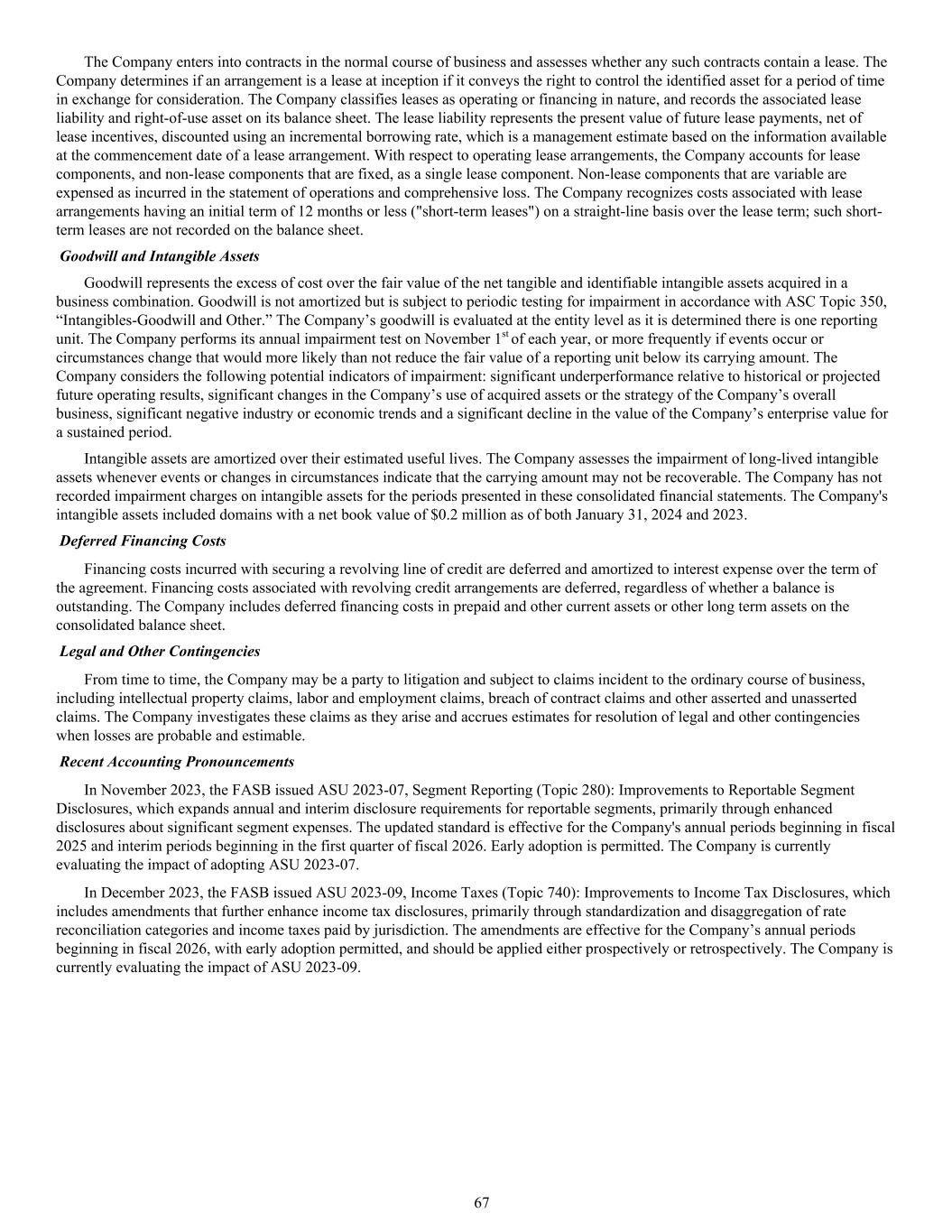 The Company enters into contracts in the normal course of business and assesses whether any such contracts contain a lease. The Company determines if an arrangement is a lease at inception if it conveys the right to control the identified asset for a period of time in exchange for consideration. The Company classifies leases as operating or financing in nature, and records the associated lease liability and right-of-use asset on its balance sheet. The lease liability represents the present value of future lease payments, net of lease incentives, discounted using an incremental borrowing rate, which is a management estimate based on the information available at the commencement date of a lease arrangement. With respect to operating lease arrangements, the Company accounts for lease components, and non-lease components that are fixed, as a single lease component. Non-lease components that are variable are expensed as incurred in the statement of operations and comprehensive loss. The Company recognizes costs associated with lease arrangements having an initial term of 12 months or less ("short-term leases") on a straight-line basis over the lease term; such short- term leases are not recorded on the balance sheet. Goodwill and Intangible Assets Goodwill represents the excess of cost over the fair value of the net tangible and identifiable intangible assets acquired in a business combination. Goodwill is not amortized but is subject to periodic testing for impairment in accordance with ASC Topic 350, “Intangibles-Goodwill and Other.” The Company’s goodwill is evaluated at the entity level as it is determined there is one reporting unit. The Company performs its annual impairment test on November 1st of each year, or more frequently if events occur or circumstances change that would more likely than not reduce the fair value of a reporting unit below its carrying amount. The Company considers the following potential indicators of impairment: significant underperformance relative to historical or projected future operating results, significant changes in the Company’s use of acquired assets or the strategy of the Company’s overall business, significant negative industry or economic trends and a significant decline in the value of the Company’s enterprise value for a sustained period. Intangible assets are amortized over their estimated useful lives. The Company assesses the impairment of long-lived intangible assets whenever events or changes in circumstances indicate that the carrying amount may not be recoverable. The Company has not recorded impairment charges on intangible assets for the periods presented in these consolidated financial statements. The Company's intangible assets included domains with a net book value of $0.2 million as of both January 31, 2024 and 2023. Deferred Financing Costs Financing costs incurred with securing a revolving line of credit are deferred and amortized to interest expense over the term of the agreement. Financing costs associated with revolving credit arrangements are deferred, regardless of whether a balance is outstanding. The Company includes deferred financing costs in prepaid and other current assets or other long term assets on the consolidated balance sheet. Legal and Other Contingencies From time to time, the Company may be a party to litigation and subject to claims incident to the ordinary course of business, including intellectual property claims, labor and employment claims, breach of contract claims and other asserted and unasserted claims. The Company investigates these claims as they arise and accrues estimates for resolution of legal and other contingencies when losses are probable and estimable. Recent Accounting Pronouncements In November 2023, the FASB issued ASU 2023-07, Segment Reporting (Topic 280): Improvements to Reportable Segment Disclosures, which expands annual and interim disclosure requirements for reportable segments, primarily through enhanced disclosures about significant segment expenses. The updated standard is effective for the Company's annual periods beginning in fiscal 2025 and interim periods beginning in the first quarter of fiscal 2026. Early adoption is permitted. The Company is currently evaluating the impact of adopting ASU 2023-07. In December 2023, the FASB issued ASU 2023-09, Income Taxes (Topic 740): Improvements to Income Tax Disclosures, which includes amendments that further enhance income tax disclosures, primarily through standardization and disaggregation of rate reconciliation categories and income taxes paid by jurisdiction. The amendments are effective for the Company’s annual periods beginning in fiscal 2026, with early adoption permitted, and should be applied either prospectively or retrospectively. The Company is currently evaluating the impact of ASU 2023-09. 67