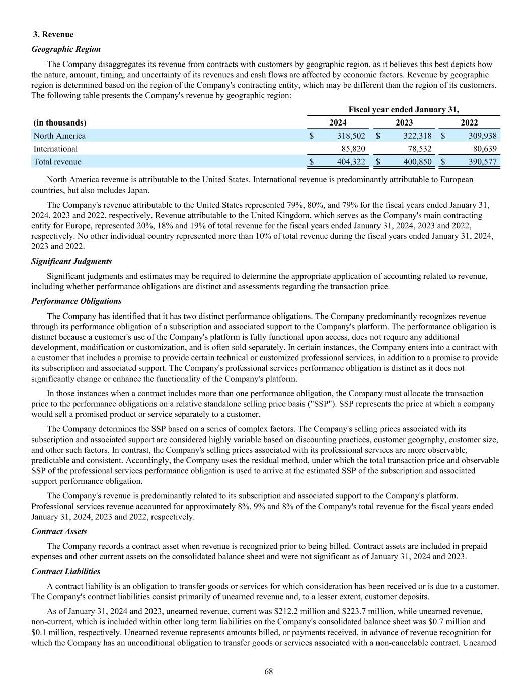 3. Revenue Geographic Region The Company disaggregates its revenue from contracts with customers by geographic region, as it believes this best depicts how the nature, amount, timing, and uncertainty of its revenues and cash flows are affected by economic factors. Revenue by geographic region is determined based on the region of the Company's contracting entity, which may be different than the region of its customers. The following table presents the Company's revenue by geographic region: Fiscal year ended January 31, (in thousands) 2024 2023 2022 North America $ 318,502 $ 322,318 $ 309,938 International 85,820 78,532 80,639 Total revenue $ 404,322 $ 400,850 $ 390,577 North America revenue is attributable to the United States. International revenue is predominantly attributable to European countries, but also includes Japan. The Company's revenue attributable to the United States represented 79%, 80%, and 79% for the fiscal years ended January 31, 2024, 2023 and 2022, respectively. Revenue attributable to the United Kingdom, which serves as the Company's main contracting entity for Europe, represented 20%, 18% and 19% of total revenue for the fiscal years ended January 31, 2024, 2023 and 2022, respectively. No other individual country represented more than 10% of total revenue during the fiscal years ended January 31, 2024, 2023 and 2022. Significant Judgments Significant judgments and estimates may be required to determine the appropriate application of accounting related to revenue, including whether performance obligations are distinct and assessments regarding the transaction price. Performance Obligations The Company has identified that it has two distinct performance obligations. The Company predominantly recognizes revenue through its performance obligation of a subscription and associated support to the Company's platform. The performance obligation is distinct because a customer's use of the Company's platform is fully functional upon access, does not require any additional development, modification or customization, and is often sold separately. In certain instances, the Company enters into a contract with a customer that includes a promise to provide certain technical or customized professional services, in addition to a promise to provide its subscription and associated support. The Company's professional services performance obligation is distinct as it does not significantly change or enhance the functionality of the Company's platform. In those instances when a contract includes more than one performance obligation, the Company must allocate the transaction price to the performance obligations on a relative standalone selling price basis ("SSP"). SSP represents the price at which a company would sell a promised product or service separately to a customer. The Company determines the SSP based on a series of complex factors. The Company's selling prices associated with its subscription and associated support are considered highly variable based on discounting practices, customer geography, customer size, and other such factors. In contrast, the Company's selling prices associated with its professional services are more observable, predictable and consistent. Accordingly, the Company uses the residual method, under which the total transaction price and observable SSP of the professional services performance obligation is used to arrive at the estimated SSP of the subscription and associated support performance obligation. The Company's revenue is predominantly related to its subscription and associated support to the Company's platform. Professional services revenue accounted for approximately 8%, 9% and 8% of the Company's total revenue for the fiscal years ended January 31, 2024, 2023 and 2022, respectively. Contract Assets The Company records a contract asset when revenue is recognized prior to being billed. Contract assets are included in prepaid expenses and other current assets on the consolidated balance sheet and were not significant as of January 31, 2024 and 2023. Contract Liabilities A contract liability is an obligation to transfer goods or services for which consideration has been received or is due to a customer. The Company's contract liabilities consist primarily of unearned revenue and, to a lesser extent, customer deposits. As of January 31, 2024 and 2023, unearned revenue, current was $212.2 million and $223.7 million, while unearned revenue, non-current, which is included within other long term liabilities on the Company's consolidated balance sheet was $0.7 million and $0.1 million, respectively. Unearned revenue represents amounts billed, or payments received, in advance of revenue recognition for which the Company has an unconditional obligation to transfer goods or services associated with a non-cancelable contract. Unearned 68