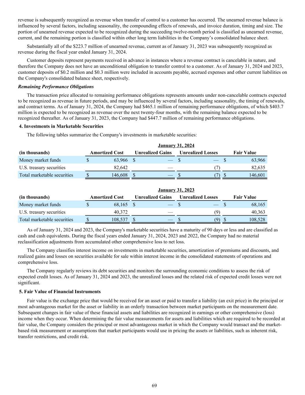 revenue is subsequently recognized as revenue when transfer of control to a customer has occurred. The unearned revenue balance is influenced by several factors, including seasonality, the compounding effects of renewals, and invoice duration, timing and size. The portion of unearned revenue expected to be recognized during the succeeding twelve-month period is classified as unearned revenue, current, and the remaining portion is classified within other long term liabilities in the Company’s consolidated balance sheet. Substantially all of the $223.7 million of unearned revenue, current as of January 31, 2023 was subsequently recognized as revenue during the fiscal year ended January 31, 2024. Customer deposits represent payments received in advance in instances where a revenue contract is cancelable in nature, and therefore the Company does not have an unconditional obligation to transfer control to a customer. As of January 31, 2024 and 2023, customer deposits of $0.2 million and $0.3 million were included in accounts payable, accrued expenses and other current liabilities on the Company's consolidated balance sheet, respectively. Remaining Performance Obligations The transaction price allocated to remaining performance obligations represents amounts under non-cancelable contracts expected to be recognized as revenue in future periods, and may be influenced by several factors, including seasonality, the timing of renewals, and contract terms. As of January 31, 2024, the Company had $465.1 million of remaining performance obligations, of which $403.7 million is expected to be recognized as revenue over the next twenty-four months, with the remaining balance expected to be recognized thereafter. As of January 31, 2023, the Company had $447.7 million of remaining performance obligations. 4. Investments in Marketable Securities The following tables summarize the Company's investments in marketable securities: January 31, 2024 (in thousands) Amortized Cost Unrealized Gains Unrealized Losses Fair Value Money market funds $ 63,966 $ — $ — $ 63,966 U.S. treasury securities 82,642 — (7) 82,635 Total marketable securities $ 146,608 $ — $ (7) $ 146,601 January 31, 2023 (in thousands) Amortized Cost Unrealized Gains Unrealized Losses Fair Value Money market funds $ 68,165 $ — $ — $ 68,165 U.S. treasury securities 40,372 — (9) 40,363 Total marketable securities $ 108,537 $ — $ (9) $ 108,528 As of January 31, 2024 and 2023, the Company's marketable securities have a maturity of 90 days or less and are classified as cash and cash equivalents. During the fiscal years ended January 31, 2024, 2023 and 2022, the Company had no material reclassification adjustments from accumulated other comprehensive loss to net loss. The Company classifies interest income on investments in marketable securities, amortization of premiums and discounts, and realized gains and losses on securities available for sale within interest income in the consolidated statements of operations and comprehensive loss. The Company regularly reviews its debt securities and monitors the surrounding economic conditions to assess the risk of expected credit losses. As of January 31, 2024 and 2023, the unrealized losses and the related risk of expected credit losses were not significant. 5. Fair Value of Financial Instruments Fair value is the exchange price that would be received for an asset or paid to transfer a liability (an exit price) in the principal or most advantageous market for the asset or liability in an orderly transaction between market participants on the measurement date. Subsequent changes in fair value of these financial assets and liabilities are recognized in earnings or other comprehensive (loss) income when they occur. When determining the fair value measurements for assets and liabilities which are required to be recorded at fair value, the Company considers the principal or most advantageous market in which the Company would transact and the market- based risk measurement or assumptions that market participants would use in pricing the assets or liabilities, such as inherent risk, transfer restrictions, and credit risk. 69