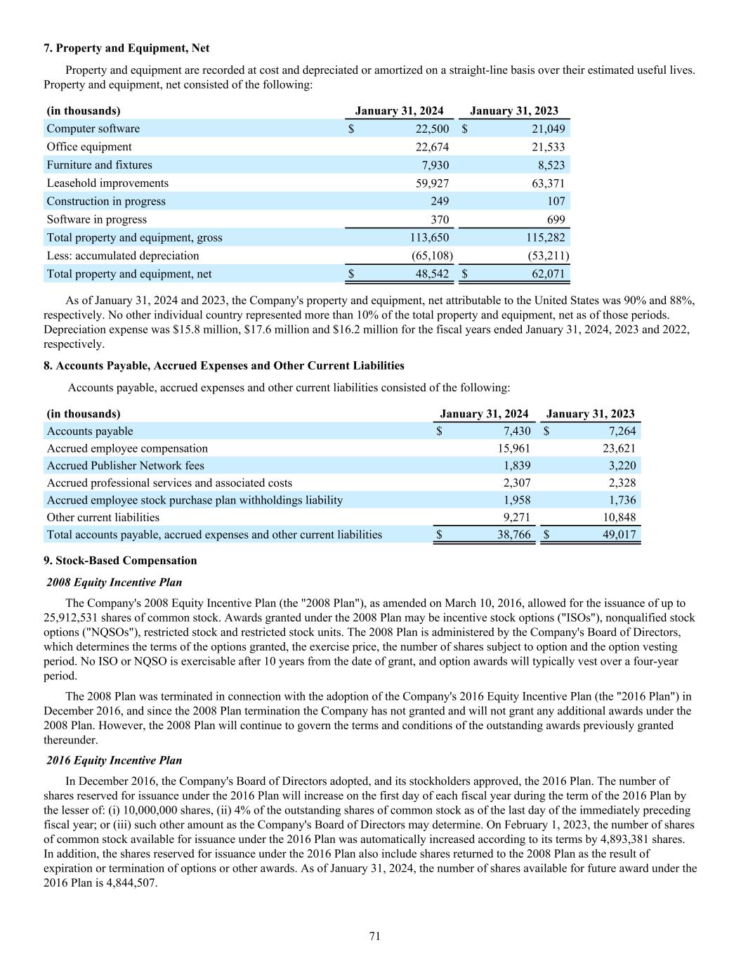 7. Property and Equipment, Net Property and equipment are recorded at cost and depreciated or amortized on a straight-line basis over their estimated useful lives. Property and equipment, net consisted of the following: (in thousands) January 31, 2024 January 31, 2023 Computer software $ 22,500 $ 21,049 Office equipment 22,674 21,533 Furniture and fixtures 7,930 8,523 Leasehold improvements 59,927 63,371 Construction in progress 249 107 Software in progress 370 699 Total property and equipment, gross 113,650 115,282 Less: accumulated depreciation (65,108) (53,211) Total property and equipment, net $ 48,542 $ 62,071 As of January 31, 2024 and 2023, the Company's property and equipment, net attributable to the United States was 90% and 88%, respectively. No other individual country represented more than 10% of the total property and equipment, net as of those periods. Depreciation expense was $15.8 million, $17.6 million and $16.2 million for the fiscal years ended January 31, 2024, 2023 and 2022, respectively. 8. Accounts Payable, Accrued Expenses and Other Current Liabilities Accounts payable, accrued expenses and other current liabilities consisted of the following: (in thousands) January 31, 2024 January 31, 2023 Accounts payable $ 7,430 $ 7,264 Accrued employee compensation 15,961 23,621 Accrued Publisher Network fees 1,839 3,220 Accrued professional services and associated costs 2,307 2,328 Accrued employee stock purchase plan withholdings liability 1,958 1,736 Other current liabilities 9,271 10,848 Total accounts payable, accrued expenses and other current liabilities $ 38,766 $ 49,017 9. Stock-Based Compensation 2008 Equity Incentive Plan The Company's 2008 Equity Incentive Plan (the "2008 Plan"), as amended on March 10, 2016, allowed for the issuance of up to 25,912,531 shares of common stock. Awards granted under the 2008 Plan may be incentive stock options ("ISOs"), nonqualified stock options ("NQSOs"), restricted stock and restricted stock units. The 2008 Plan is administered by the Company's Board of Directors, which determines the terms of the options granted, the exercise price, the number of shares subject to option and the option vesting period. No ISO or NQSO is exercisable after 10 years from the date of grant, and option awards will typically vest over a four-year period. The 2008 Plan was terminated in connection with the adoption of the Company's 2016 Equity Incentive Plan (the "2016 Plan") in December 2016, and since the 2008 Plan termination the Company has not granted and will not grant any additional awards under the 2008 Plan. However, the 2008 Plan will continue to govern the terms and conditions of the outstanding awards previously granted thereunder. 2016 Equity Incentive Plan In December 2016, the Company's Board of Directors adopted, and its stockholders approved, the 2016 Plan. The number of shares reserved for issuance under the 2016 Plan will increase on the first day of each fiscal year during the term of the 2016 Plan by the lesser of: (i) 10,000,000 shares, (ii) 4% of the outstanding shares of common stock as of the last day of the immediately preceding fiscal year; or (iii) such other amount as the Company's Board of Directors may determine. On February 1, 2023, the number of shares of common stock available for issuance under the 2016 Plan was automatically increased according to its terms by 4,893,381 shares. In addition, the shares reserved for issuance under the 2016 Plan also include shares returned to the 2008 Plan as the result of expiration or termination of options or other awards. As of January 31, 2024, the number of shares available for future award under the 2016 Plan is 4,844,507. 71