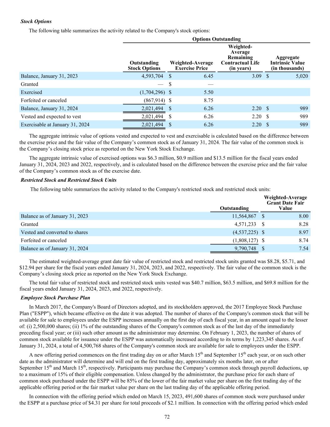 Stock Options The following table summarizes the activity related to the Company's stock options: Options Outstanding Outstanding Stock Options Weighted-Average Exercise Price Weighted- Average Remaining Contractual Life (in years) Aggregate Intrinsic Value (in thousands) Balance, January 31, 2023 4,593,704 $ 6.45 3.09 $ 5,020 Granted — $ — Exercised (1,704,296) $ 5.50 Forfeited or canceled (867,914) $ 8.75 Balance, January 31, 2024 2,021,494 $ 6.26 2.20 $ 989 Vested and expected to vest 2,021,494 $ 6.26 2.20 $ 989 Exercisable at January 31, 2024 2,021,494 $ 6.26 2.20 $ 989 The aggregate intrinsic value of options vested and expected to vest and exercisable is calculated based on the difference between the exercise price and the fair value of the Company’s common stock as of January 31, 2024. The fair value of the common stock is the Company’s closing stock price as reported on the New York Stock Exchange. The aggregate intrinsic value of exercised options was $6.3 million, $0.9 million and $13.5 million for the fiscal years ended January 31, 2024, 2023 and 2022, respectively, and is calculated based on the difference between the exercise price and the fair value of the Company’s common stock as of the exercise date. Restricted Stock and Restricted Stock Units The following table summarizes the activity related to the Company's restricted stock and restricted stock units: Outstanding Weighted-Average Grant Date Fair Value Balance as of January 31, 2023 11,564,867 $ 8.00 Granted 4,571,233 $ 8.28 Vested and converted to shares (4,537,225) $ 8.97 Forfeited or canceled (1,808,127) $ 8.74 Balance as of January 31, 2024 9,790,748 $ 7.54 The estimated weighted-average grant date fair value of restricted stock and restricted stock units granted was $8.28, $5.71, and $12.94 per share for the fiscal years ended January 31, 2024, 2023, and 2022, respectively. The fair value of the common stock is the Company’s closing stock price as reported on the New York Stock Exchange. The total fair value of restricted stock and restricted stock units vested was $40.7 million, $63.5 million, and $69.8 million for the fiscal years ended January 31, 2024, 2023, and 2022, respectively. Employee Stock Purchase Plan In March 2017, the Company's Board of Directors adopted, and its stockholders approved, the 2017 Employee Stock Purchase Plan ("ESPP"), which became effective on the date it was adopted. The number of shares of the Company's common stock that will be available for sale to employees under the ESPP increases annually on the first day of each fiscal year, in an amount equal to the lesser of: (i) 2,500,000 shares; (ii) 1% of the outstanding shares of the Company's common stock as of the last day of the immediately preceding fiscal year; or (iii) such other amount as the administrator may determine. On February 1, 2023, the number of shares of common stock available for issuance under the ESPP was automatically increased according to its terms by 1,223,345 shares. As of January 31, 2024, a total of 4,500,768 shares of the Company's common stock are available for sale to employees under the ESPP. A new offering period commences on the first trading day on or after March 15th and September 15th each year, or on such other date as the administrator will determine and will end on the first trading day, approximately six months later, on or after September 15th and March 15th, respectively. Participants may purchase the Company’s common stock through payroll deductions, up to a maximum of 15% of their eligible compensation. Unless changed by the administrator, the purchase price for each share of common stock purchased under the ESPP will be 85% of the lower of the fair market value per share on the first trading day of the applicable offering period or the fair market value per share on the last trading day of the applicable offering period. In connection with the offering period which ended on March 15, 2023, 491,600 shares of common stock were purchased under the ESPP at a purchase price of $4.31 per share for total proceeds of $2.1 million. In connection with the offering period which ended 72