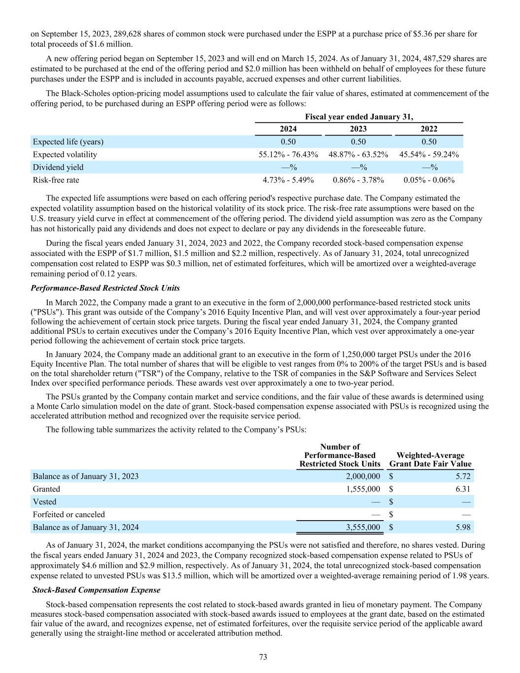 on September 15, 2023, 289,628 shares of common stock were purchased under the ESPP at a purchase price of $5.36 per share for total proceeds of $1.6 million. A new offering period began on September 15, 2023 and will end on March 15, 2024. As of January 31, 2024, 487,529 shares are estimated to be purchased at the end of the offering period and $2.0 million has been withheld on behalf of employees for these future purchases under the ESPP and is included in accounts payable, accrued expenses and other current liabilities. The Black-Scholes option-pricing model assumptions used to calculate the fair value of shares, estimated at commencement of the offering period, to be purchased during an ESPP offering period were as follows: Fiscal year ended January 31, 2024 2023 2022 Expected life (years) 0.50 0.50 0.50 Expected volatility 55.12% - 76.43% 48.87% - 63.52% 45.54% - 59.24% Dividend yield —% —% —% Risk-free rate 4.73% - 5.49% 0.86% - 3.78% 0.05% - 0.06% The expected life assumptions were based on each offering period's respective purchase date. The Company estimated the expected volatility assumption based on the historical volatility of its stock price. The risk-free rate assumptions were based on the U.S. treasury yield curve in effect at commencement of the offering period. The dividend yield assumption was zero as the Company has not historically paid any dividends and does not expect to declare or pay any dividends in the foreseeable future. During the fiscal years ended January 31, 2024, 2023 and 2022, the Company recorded stock-based compensation expense associated with the ESPP of $1.7 million, $1.5 million and $2.2 million, respectively. As of January 31, 2024, total unrecognized compensation cost related to ESPP was $0.3 million, net of estimated forfeitures, which will be amortized over a weighted-average remaining period of 0.12 years. Performance-Based Restricted Stock Units In March 2022, the Company made a grant to an executive in the form of 2,000,000 performance-based restricted stock units ("PSUs"). This grant was outside of the Company’s 2016 Equity Incentive Plan, and will vest over approximately a four-year period following the achievement of certain stock price targets. During the fiscal year ended January 31, 2024, the Company granted additional PSUs to certain executives under the Company’s 2016 Equity Incentive Plan, which vest over approximately a one-year period following the achievement of certain stock price targets. In January 2024, the Company made an additional grant to an executive in the form of 1,250,000 target PSUs under the 2016 Equity Incentive Plan. The total number of shares that will be eligible to vest ranges from 0% to 200% of the target PSUs and is based on the total shareholder return ("TSR") of the Company, relative to the TSR of companies in the S&P Software and Services Select Index over specified performance periods. These awards vest over approximately a one to two-year period. The PSUs granted by the Company contain market and service conditions, and the fair value of these awards is determined using a Monte Carlo simulation model on the date of grant. Stock-based compensation expense associated with PSUs is recognized using the accelerated attribution method and recognized over the requisite service period. The following table summarizes the activity related to the Company’s PSUs: Number of Performance-Based Restricted Stock Units Weighted-Average Grant Date Fair Value Balance as of January 31, 2023 2,000,000 $ 5.72 Granted 1,555,000 $ 6.31 Vested — $ — Forfeited or canceled — $ — Balance as of January 31, 2024 3,555,000 $ 5.98 As of January 31, 2024, the market conditions accompanying the PSUs were not satisfied and therefore, no shares vested. During the fiscal years ended January 31, 2024 and 2023, the Company recognized stock-based compensation expense related to PSUs of approximately $4.6 million and $2.9 million, respectively. As of January 31, 2024, the total unrecognized stock-based compensation expense related to unvested PSUs was $13.5 million, which will be amortized over a weighted-average remaining period of 1.98 years. Stock-Based Compensation Expense Stock-based compensation represents the cost related to stock-based awards granted in lieu of monetary payment. The Company measures stock-based compensation associated with stock-based awards issued to employees at the grant date, based on the estimated fair value of the award, and recognizes expense, net of estimated forfeitures, over the requisite service period of the applicable award generally using the straight-line method or accelerated attribution method. 73