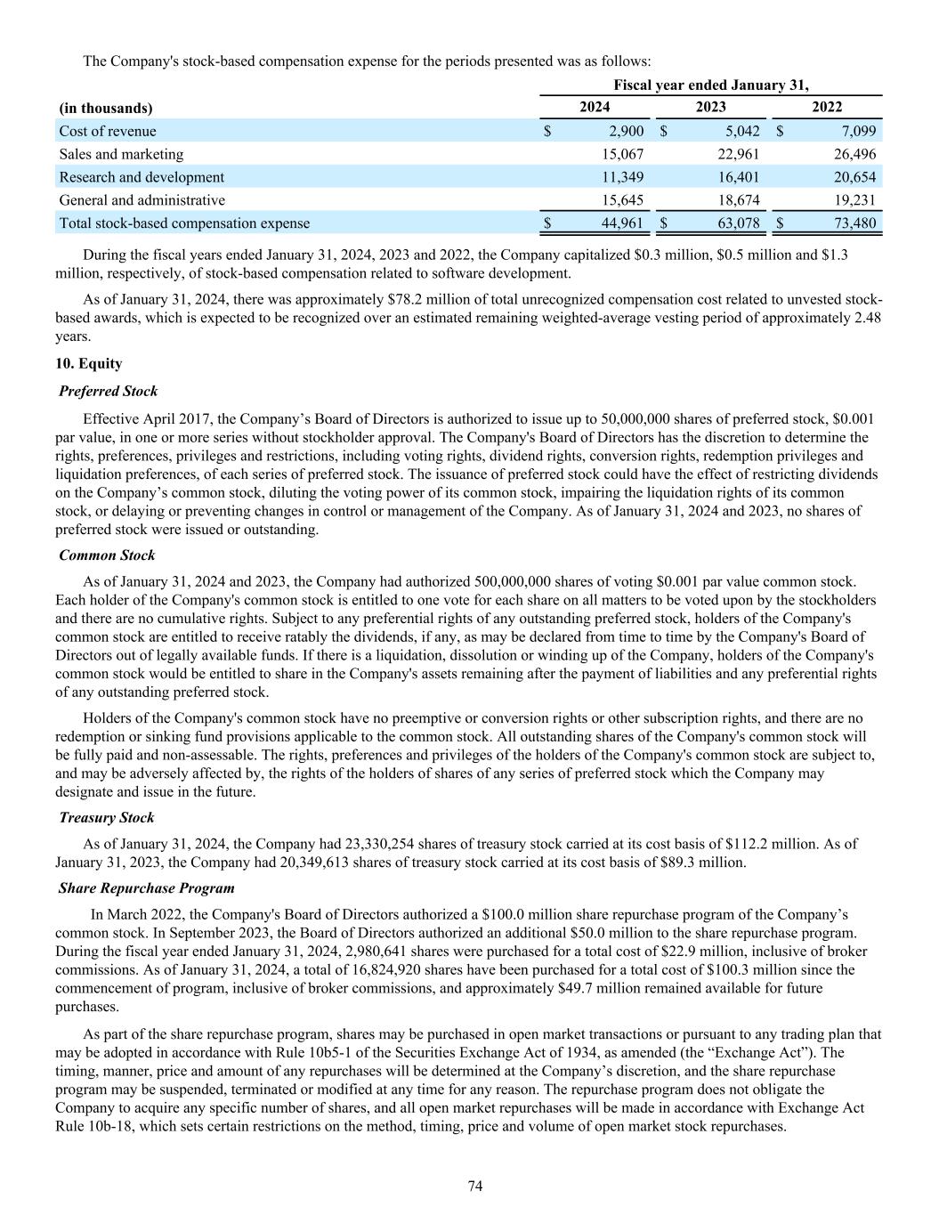 The Company's stock-based compensation expense for the periods presented was as follows: Fiscal year ended January 31, (in thousands) 2024 2023 2022 Cost of revenue $ 2,900 $ 5,042 $ 7,099 Sales and marketing 15,067 22,961 26,496 Research and development 11,349 16,401 20,654 General and administrative 15,645 18,674 19,231 Total stock-based compensation expense $ 44,961 $ 63,078 $ 73,480 During the fiscal years ended January 31, 2024, 2023 and 2022, the Company capitalized $0.3 million, $0.5 million and $1.3 million, respectively, of stock-based compensation related to software development. As of January 31, 2024, there was approximately $78.2 million of total unrecognized compensation cost related to unvested stock- based awards, which is expected to be recognized over an estimated remaining weighted-average vesting period of approximately 2.48 years. 10. Equity Preferred Stock Effective April 2017, the Company’s Board of Directors is authorized to issue up to 50,000,000 shares of preferred stock, $0.001 par value, in one or more series without stockholder approval. The Company's Board of Directors has the discretion to determine the rights, preferences, privileges and restrictions, including voting rights, dividend rights, conversion rights, redemption privileges and liquidation preferences, of each series of preferred stock. The issuance of preferred stock could have the effect of restricting dividends on the Company’s common stock, diluting the voting power of its common stock, impairing the liquidation rights of its common stock, or delaying or preventing changes in control or management of the Company. As of January 31, 2024 and 2023, no shares of preferred stock were issued or outstanding. Common Stock As of January 31, 2024 and 2023, the Company had authorized 500,000,000 shares of voting $0.001 par value common stock. Each holder of the Company's common stock is entitled to one vote for each share on all matters to be voted upon by the stockholders and there are no cumulative rights. Subject to any preferential rights of any outstanding preferred stock, holders of the Company's common stock are entitled to receive ratably the dividends, if any, as may be declared from time to time by the Company's Board of Directors out of legally available funds. If there is a liquidation, dissolution or winding up of the Company, holders of the Company's common stock would be entitled to share in the Company's assets remaining after the payment of liabilities and any preferential rights of any outstanding preferred stock. Holders of the Company's common stock have no preemptive or conversion rights or other subscription rights, and there are no redemption or sinking fund provisions applicable to the common stock. All outstanding shares of the Company's common stock will be fully paid and non-assessable. The rights, preferences and privileges of the holders of the Company's common stock are subject to, and may be adversely affected by, the rights of the holders of shares of any series of preferred stock which the Company may designate and issue in the future. Treasury Stock As of January 31, 2024, the Company had 23,330,254 shares of treasury stock carried at its cost basis of $112.2 million. As of January 31, 2023, the Company had 20,349,613 shares of treasury stock carried at its cost basis of $89.3 million. Share Repurchase Program In March 2022, the Company's Board of Directors authorized a $100.0 million share repurchase program of the Company’s common stock. In September 2023, the Board of Directors authorized an additional $50.0 million to the share repurchase program. During the fiscal year ended January 31, 2024, 2,980,641 shares were purchased for a total cost of $22.9 million, inclusive of broker commissions. As of January 31, 2024, a total of 16,824,920 shares have been purchased for a total cost of $100.3 million since the commencement of program, inclusive of broker commissions, and approximately $49.7 million remained available for future purchases. As part of the share repurchase program, shares may be purchased in open market transactions or pursuant to any trading plan that may be adopted in accordance with Rule 10b5-1 of the Securities Exchange Act of 1934, as amended (the “Exchange Act”). The timing, manner, price and amount of any repurchases will be determined at the Company’s discretion, and the share repurchase program may be suspended, terminated or modified at any time for any reason. The repurchase program does not obligate the Company to acquire any specific number of shares, and all open market repurchases will be made in accordance with Exchange Act Rule 10b-18, which sets certain restrictions on the method, timing, price and volume of open market stock repurchases. 74