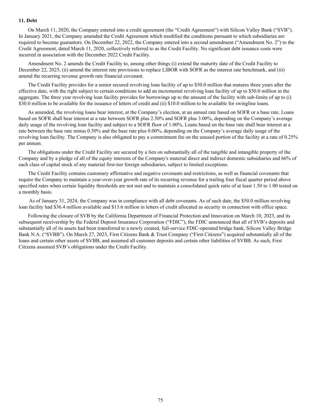 11. Debt On March 11, 2020, the Company entered into a credit agreement (the “Credit Agreement”) with Silicon Valley Bank (“SVB”). In January 2021, the Company amended the Credit Agreement which modified the conditions pursuant to which subsidiaries are required to become guarantors. On December 22, 2022, the Company entered into a second amendment (“Amendment No. 2”) to the Credit Agreement, dated March 11, 2020, collectively referred to as the Credit Facility. No significant debt issuance costs were incurred in association with the December 2022 Credit Facility. Amendment No. 2 amends the Credit Facility to, among other things (i) extend the maturity date of the Credit Facility to December 22, 2025, (ii) amend the interest rate provisions to replace LIBOR with SOFR as the interest rate benchmark, and (iii) amend the recurring revenue growth rate financial covenant. The Credit Facility provides for a senior secured revolving loan facility of up to $50.0 million that matures three years after the effective date, with the right subject to certain conditions to add an incremental revolving loan facility of up to $50.0 million in the aggregate. The three year revolving loan facility provides for borrowings up to the amount of the facility with sub-limits of up to (i) $30.0 million to be available for the issuance of letters of credit and (ii) $10.0 million to be available for swingline loans. As amended, the revolving loans bear interest, at the Company’s election, at an annual rate based on SOFR or a base rate. Loans based on SOFR shall bear interest at a rate between SOFR plus 2.50% and SOFR plus 3.00%, depending on the Company’s average daily usage of the revolving loan facility and subject to a SOFR floor of 1.00%. Loans based on the base rate shall bear interest at a rate between the base rate minus 0.50% and the base rate plus 0.00%, depending on the Company’s average daily usage of the revolving loan facility. The Company is also obligated to pay a commitment fee on the unused portion of the facility at a rate of 0.25% per annum. The obligations under the Credit Facility are secured by a lien on substantially all of the tangible and intangible property of the Company and by a pledge of all of the equity interests of the Company's material direct and indirect domestic subsidiaries and 66% of each class of capital stock of any material first-tier foreign subsidiaries, subject to limited exceptions. The Credit Facility contains customary affirmative and negative covenants and restrictions, as well as financial covenants that require the Company to maintain a year-over-year growth rate of its recurring revenue for a trailing four fiscal quarter period above specified rates when certain liquidity thresholds are not met and to maintain a consolidated quick ratio of at least 1.50 to 1.00 tested on a monthly basis. As of January 31, 2024, the Company was in compliance with all debt covenants. As of such date, the $50.0 million revolving loan facility had $36.4 million available and $13.6 million in letters of credit allocated as security in connection with office space. Following the closure of SVB by the California Department of Financial Protection and Innovation on March 10, 2023, and its subsequent receivership by the Federal Deposit Insurance Corporation (“FDIC”), the FDIC announced that all of SVB’s deposits and substantially all of its assets had been transferred to a newly created, full-service FDIC-operated bridge bank, Silicon Valley Bridge Bank N.A. (“SVBB”). On March 27, 2023, First Citizens Bank & Trust Company (“First Citizens”) acquired substantially all of the loans and certain other assets of SVBB, and assumed all customer deposits and certain other liabilities of SVBB. As such, First Citizens assumed SVB’s obligations under the Credit Facility. 75