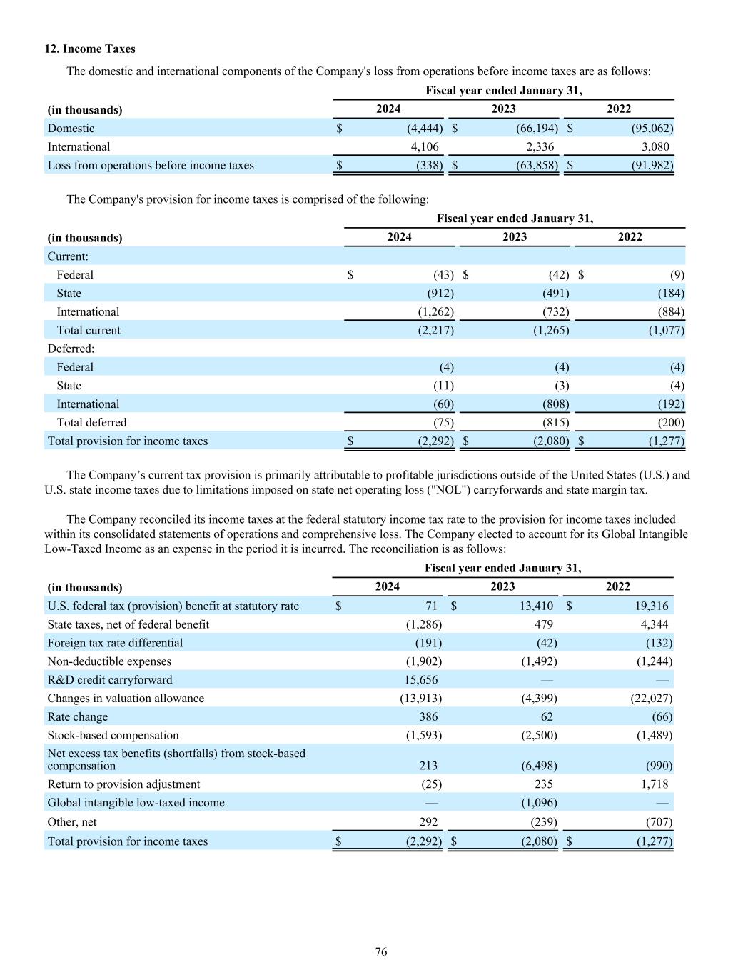 12. Income Taxes The domestic and international components of the Company's loss from operations before income taxes are as follows: Fiscal year ended January 31, (in thousands) 2024 2023 2022 Domestic $ (4,444) $ (66,194) $ (95,062) International 4,106 2,336 3,080 Loss from operations before income taxes $ (338) $ (63,858) $ (91,982) The Company's provision for income taxes is comprised of the following: Fiscal year ended January 31, (in thousands) 2024 2023 2022 Current: Federal $ (43) $ (42) $ (9) State (912) (491) (184) International (1,262) (732) (884) Total current (2,217) (1,265) (1,077) Deferred: Federal (4) (4) (4) State (11) (3) (4) International (60) (808) (192) Total deferred (75) (815) (200) Total provision for income taxes $ (2,292) $ (2,080) $ (1,277) The Company’s current tax provision is primarily attributable to profitable jurisdictions outside of the United States (U.S.) and U.S. state income taxes due to limitations imposed on state net operating loss ("NOL") carryforwards and state margin tax. The Company reconciled its income taxes at the federal statutory income tax rate to the provision for income taxes included within its consolidated statements of operations and comprehensive loss. The Company elected to account for its Global Intangible Low-Taxed Income as an expense in the period it is incurred. The reconciliation is as follows: Fiscal year ended January 31, (in thousands) 2024 2023 2022 U.S. federal tax (provision) benefit at statutory rate $ 71 $ 13,410 $ 19,316 State taxes, net of federal benefit (1,286) 479 4,344 Foreign tax rate differential (191) (42) (132) Non-deductible expenses (1,902) (1,492) (1,244) R&D credit carryforward 15,656 — — Changes in valuation allowance (13,913) (4,399) (22,027) Rate change 386 62 (66) Stock-based compensation (1,593) (2,500) (1,489) Net excess tax benefits (shortfalls) from stock-based compensation 213 (6,498) (990) Return to provision adjustment (25) 235 1,718 Global intangible low-taxed income — (1,096) — Other, net 292 (239) (707) Total provision for income taxes $ (2,292) $ (2,080) $ (1,277) 76