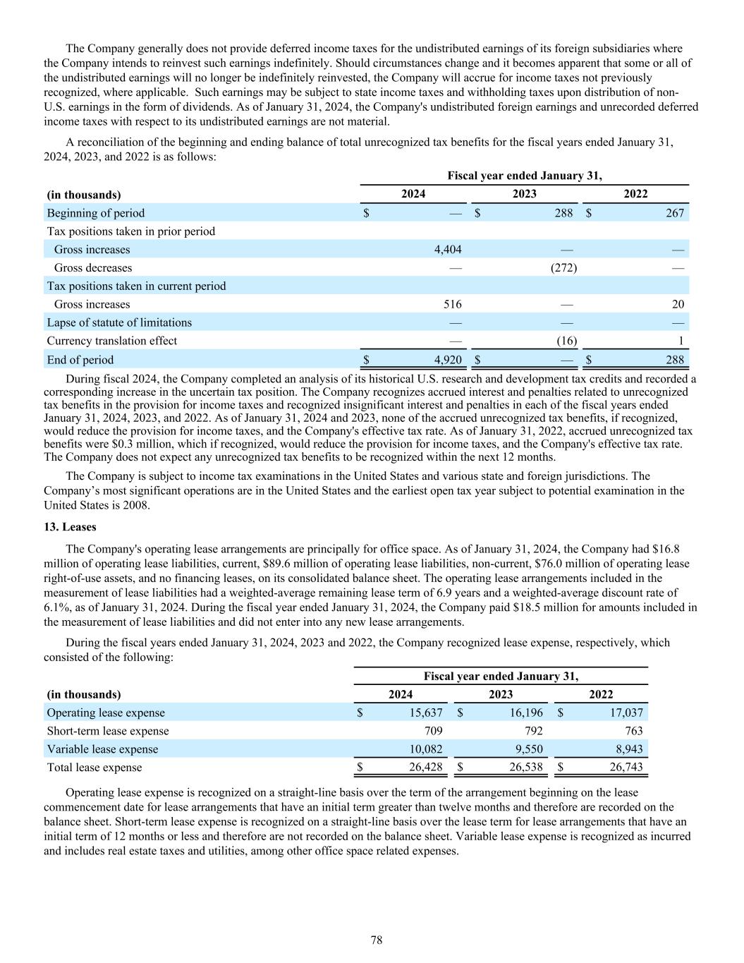The Company generally does not provide deferred income taxes for the undistributed earnings of its foreign subsidiaries where the Company intends to reinvest such earnings indefinitely. Should circumstances change and it becomes apparent that some or all of the undistributed earnings will no longer be indefinitely reinvested, the Company will accrue for income taxes not previously recognized, where applicable. Such earnings may be subject to state income taxes and withholding taxes upon distribution of non- U.S. earnings in the form of dividends. As of January 31, 2024, the Company's undistributed foreign earnings and unrecorded deferred income taxes with respect to its undistributed earnings are not material. A reconciliation of the beginning and ending balance of total unrecognized tax benefits for the fiscal years ended January 31, 2024, 2023, and 2022 is as follows: Fiscal year ended January 31, (in thousands) 2024 2023 2022 Beginning of period $ — $ 288 $ 267 Tax positions taken in prior period Gross increases 4,404 — — Gross decreases — (272) — Tax positions taken in current period Gross increases 516 — 20 Lapse of statute of limitations — — — Currency translation effect — (16) 1 End of period $ 4,920 $ — $ 288 During fiscal 2024, the Company completed an analysis of its historical U.S. research and development tax credits and recorded a corresponding increase in the uncertain tax position. The Company recognizes accrued interest and penalties related to unrecognized tax benefits in the provision for income taxes and recognized insignificant interest and penalties in each of the fiscal years ended January 31, 2024, 2023, and 2022. As of January 31, 2024 and 2023, none of the accrued unrecognized tax benefits, if recognized, would reduce the provision for income taxes, and the Company's effective tax rate. As of January 31, 2022, accrued unrecognized tax benefits were $0.3 million, which if recognized, would reduce the provision for income taxes, and the Company's effective tax rate. The Company does not expect any unrecognized tax benefits to be recognized within the next 12 months. The Company is subject to income tax examinations in the United States and various state and foreign jurisdictions. The Company’s most significant operations are in the United States and the earliest open tax year subject to potential examination in the United States is 2008. 13. Leases The Company's operating lease arrangements are principally for office space. As of January 31, 2024, the Company had $16.8 million of operating lease liabilities, current, $89.6 million of operating lease liabilities, non-current, $76.0 million of operating lease right-of-use assets, and no financing leases, on its consolidated balance sheet. The operating lease arrangements included in the measurement of lease liabilities had a weighted-average remaining lease term of 6.9 years and a weighted-average discount rate of 6.1%, as of January 31, 2024. During the fiscal year ended January 31, 2024, the Company paid $18.5 million for amounts included in the measurement of lease liabilities and did not enter into any new lease arrangements. During the fiscal years ended January 31, 2024, 2023 and 2022, the Company recognized lease expense, respectively, which consisted of the following: Fiscal year ended January 31, (in thousands) 2024 2023 2022 Operating lease expense $ 15,637 $ 16,196 $ 17,037 Short-term lease expense 709 792 763 Variable lease expense 10,082 9,550 8,943 Total lease expense $ 26,428 $ 26,538 $ 26,743 Operating lease expense is recognized on a straight-line basis over the term of the arrangement beginning on the lease commencement date for lease arrangements that have an initial term greater than twelve months and therefore are recorded on the balance sheet. Short-term lease expense is recognized on a straight-line basis over the lease term for lease arrangements that have an initial term of 12 months or less and therefore are not recorded on the balance sheet. Variable lease expense is recognized as incurred and includes real estate taxes and utilities, among other office space related expenses. 78
