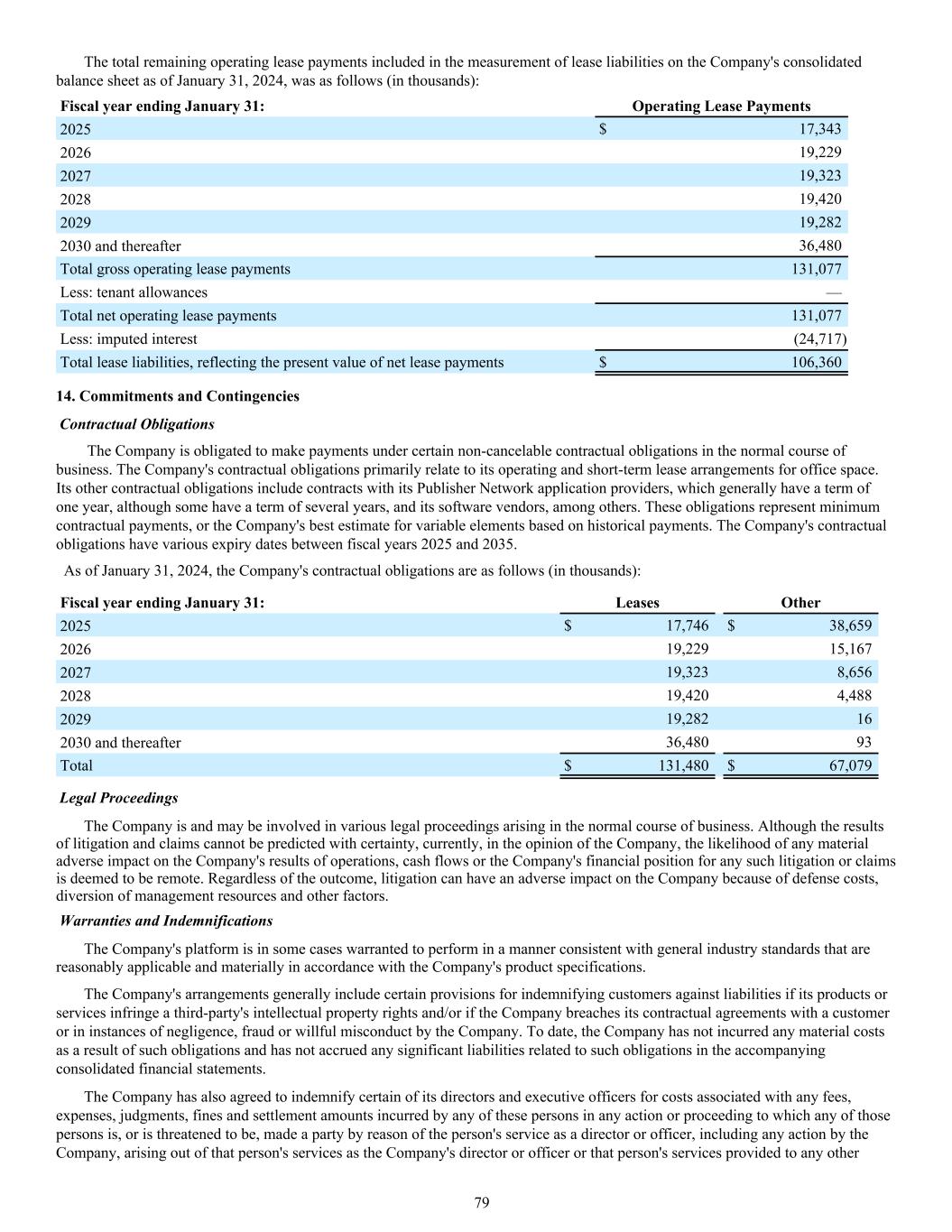 The total remaining operating lease payments included in the measurement of lease liabilities on the Company's consolidated balance sheet as of January 31, 2024, was as follows (in thousands): Fiscal year ending January 31: Operating Lease Payments 2025 $ 17,343 2026 19,229 2027 19,323 2028 19,420 2029 19,282 2030 and thereafter 36,480 Total gross operating lease payments 131,077 Less: tenant allowances — Total net operating lease payments 131,077 Less: imputed interest (24,717) Total lease liabilities, reflecting the present value of net lease payments $ 106,360 14. Commitments and Contingencies Contractual Obligations The Company is obligated to make payments under certain non-cancelable contractual obligations in the normal course of business. The Company's contractual obligations primarily relate to its operating and short-term lease arrangements for office space. Its other contractual obligations include contracts with its Publisher Network application providers, which generally have a term of one year, although some have a term of several years, and its software vendors, among others. These obligations represent minimum contractual payments, or the Company's best estimate for variable elements based on historical payments. The Company's contractual obligations have various expiry dates between fiscal years 2025 and 2035. As of January 31, 2024, the Company's contractual obligations are as follows (in thousands): Fiscal year ending January 31: Leases Other 2025 $ 17,746 $ 38,659 2026 19,229 15,167 2027 19,323 8,656 2028 19,420 4,488 2029 19,282 16 2030 and thereafter 36,480 93 Total $ 131,480 $ 67,079 Legal Proceedings The Company is and may be involved in various legal proceedings arising in the normal course of business. Although the results of litigation and claims cannot be predicted with certainty, currently, in the opinion of the Company, the likelihood of any material adverse impact on the Company's results of operations, cash flows or the Company's financial position for any such litigation or claims is deemed to be remote. Regardless of the outcome, litigation can have an adverse impact on the Company because of defense costs, diversion of management resources and other factors. Warranties and Indemnifications The Company's platform is in some cases warranted to perform in a manner consistent with general industry standards that are reasonably applicable and materially in accordance with the Company's product specifications. The Company's arrangements generally include certain provisions for indemnifying customers against liabilities if its products or services infringe a third-party's intellectual property rights and/or if the Company breaches its contractual agreements with a customer or in instances of negligence, fraud or willful misconduct by the Company. To date, the Company has not incurred any material costs as a result of such obligations and has not accrued any significant liabilities related to such obligations in the accompanying consolidated financial statements. The Company has also agreed to indemnify certain of its directors and executive officers for costs associated with any fees, expenses, judgments, fines and settlement amounts incurred by any of these persons in any action or proceeding to which any of those persons is, or is threatened to be, made a party by reason of the person's service as a director or officer, including any action by the Company, arising out of that person's services as the Company's director or officer or that person's services provided to any other 79