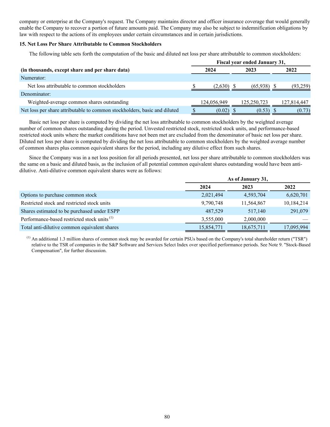 company or enterprise at the Company's request. The Company maintains director and officer insurance coverage that would generally enable the Company to recover a portion of future amounts paid. The Company may also be subject to indemnification obligations by law with respect to the actions of its employees under certain circumstances and in certain jurisdictions. 15. Net Loss Per Share Attributable to Common Stockholders The following table sets forth the computation of the basic and diluted net loss per share attributable to common stockholders: Fiscal year ended January 31, (in thousands, except share and per share data) 2024 2023 2022 Numerator: Net loss attributable to common stockholders $ (2,630) $ (65,938) $ (93,259) Denominator: Weighted-average common shares outstanding 124,056,949 125,250,723 127,814,447 Net loss per share attributable to common stockholders, basic and diluted $ (0.02) $ (0.53) $ (0.73) Basic net loss per share is computed by dividing the net loss attributable to common stockholders by the weighted average number of common shares outstanding during the period. Unvested restricted stock, restricted stock units, and performance-based restricted stock units where the market conditions have not been met are excluded from the denominator of basic net loss per share. Diluted net loss per share is computed by dividing the net loss attributable to common stockholders by the weighted average number of common shares plus common equivalent shares for the period, including any dilutive effect from such shares. Since the Company was in a net loss position for all periods presented, net loss per share attributable to common stockholders was the same on a basic and diluted basis, as the inclusion of all potential common equivalent shares outstanding would have been anti- dilutive. Anti-dilutive common equivalent shares were as follows: As of January 31, 2024 2023 2022 Options to purchase common stock 2,021,494 4,593,704 6,620,701 Restricted stock and restricted stock units 9,790,748 11,564,867 10,184,214 Shares estimated to be purchased under ESPP 487,529 517,140 291,079 Performance-based restricted stock units (1) 3,555,000 2,000,000 — Total anti-dilutive common equivalent shares 15,854,771 18,675,711 17,095,994 (1) An additional 1.3 million shares of common stock may be awarded for certain PSUs based on the Company's total shareholder return ("TSR") relative to the TSR of companies in the S&P Software and Services Select Index over specified performance periods. See Note 9. "Stock-Based Compensation", for further discussion. 80