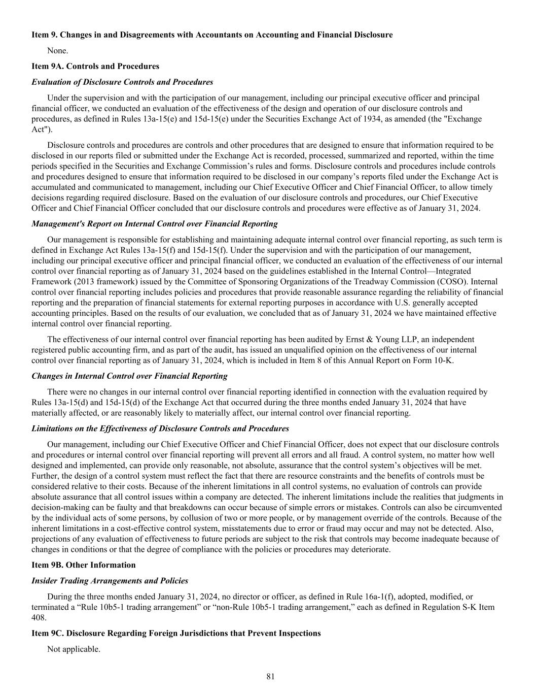 Item 9. Changes in and Disagreements with Accountants on Accounting and Financial Disclosure None. Item 9A. Controls and Procedures Evaluation of Disclosure Controls and Procedures Under the supervision and with the participation of our management, including our principal executive officer and principal financial officer, we conducted an evaluation of the effectiveness of the design and operation of our disclosure controls and procedures, as defined in Rules 13a-15(e) and 15d-15(e) under the Securities Exchange Act of 1934, as amended (the "Exchange Act"). Disclosure controls and procedures are controls and other procedures that are designed to ensure that information required to be disclosed in our reports filed or submitted under the Exchange Act is recorded, processed, summarized and reported, within the time periods specified in the Securities and Exchange Commission’s rules and forms. Disclosure controls and procedures include controls and procedures designed to ensure that information required to be disclosed in our company’s reports filed under the Exchange Act is accumulated and communicated to management, including our Chief Executive Officer and Chief Financial Officer, to allow timely decisions regarding required disclosure. Based on the evaluation of our disclosure controls and procedures, our Chief Executive Officer and Chief Financial Officer concluded that our disclosure controls and procedures were effective as of January 31, 2024. Management's Report on Internal Control over Financial Reporting Our management is responsible for establishing and maintaining adequate internal control over financial reporting, as such term is defined in Exchange Act Rules 13a-15(f) and 15d-15(f). Under the supervision and with the participation of our management, including our principal executive officer and principal financial officer, we conducted an evaluation of the effectiveness of our internal control over financial reporting as of January 31, 2024 based on the guidelines established in the Internal Control—Integrated Framework (2013 framework) issued by the Committee of Sponsoring Organizations of the Treadway Commission (COSO). Internal control over financial reporting includes policies and procedures that provide reasonable assurance regarding the reliability of financial reporting and the preparation of financial statements for external reporting purposes in accordance with U.S. generally accepted accounting principles. Based on the results of our evaluation, we concluded that as of January 31, 2024 we have maintained effective internal control over financial reporting. The effectiveness of our internal control over financial reporting has been audited by Ernst & Young LLP, an independent registered public accounting firm, and as part of the audit, has issued an unqualified opinion on the effectiveness of our internal control over financial reporting as of January 31, 2024, which is included in Item 8 of this Annual Report on Form 10-K. Changes in Internal Control over Financial Reporting There were no changes in our internal control over financial reporting identified in connection with the evaluation required by Rules 13a-15(d) and 15d-15(d) of the Exchange Act that occurred during the three months ended January 31, 2024 that have materially affected, or are reasonably likely to materially affect, our internal control over financial reporting. Limitations on the Effectiveness of Disclosure Controls and Procedures Our management, including our Chief Executive Officer and Chief Financial Officer, does not expect that our disclosure controls and procedures or internal control over financial reporting will prevent all errors and all fraud. A control system, no matter how well designed and implemented, can provide only reasonable, not absolute, assurance that the control system’s objectives will be met. Further, the design of a control system must reflect the fact that there are resource constraints and the benefits of controls must be considered relative to their costs. Because of the inherent limitations in all control systems, no evaluation of controls can provide absolute assurance that all control issues within a company are detected. The inherent limitations include the realities that judgments in decision-making can be faulty and that breakdowns can occur because of simple errors or mistakes. Controls can also be circumvented by the individual acts of some persons, by collusion of two or more people, or by management override of the controls. Because of the inherent limitations in a cost-effective control system, misstatements due to error or fraud may occur and may not be detected. Also, projections of any evaluation of effectiveness to future periods are subject to the risk that controls may become inadequate because of changes in conditions or that the degree of compliance with the policies or procedures may deteriorate. Item 9B. Other Information Insider Trading Arrangements and Policies During the three months ended January 31, 2024, no director or officer, as defined in Rule 16a-1(f), adopted, modified, or terminated a “Rule 10b5-1 trading arrangement” or “non-Rule 10b5-1 trading arrangement,” each as defined in Regulation S-K Item 408. Item 9C. Disclosure Regarding Foreign Jurisdictions that Prevent Inspections Not applicable. 81