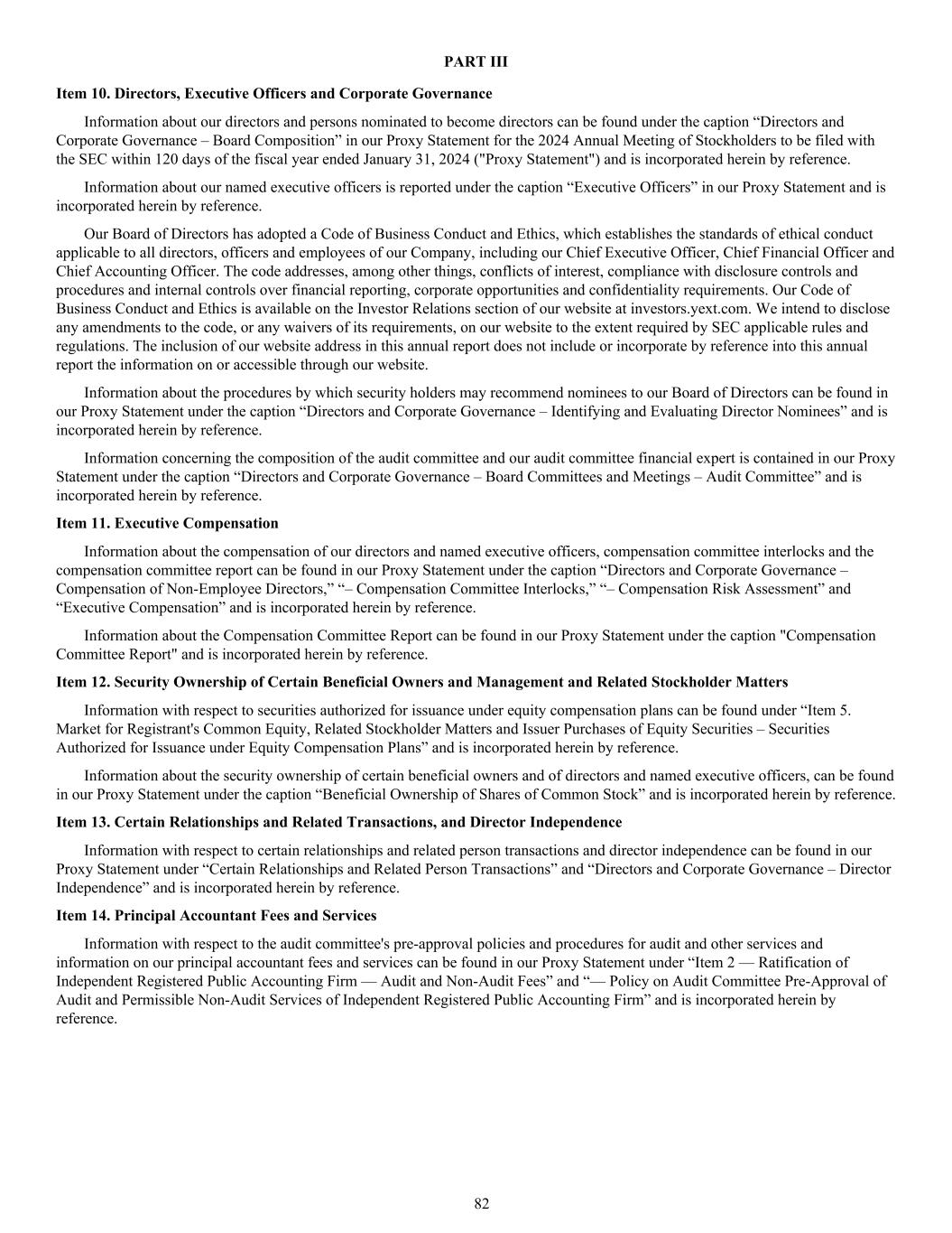 PART III Item 10. Directors, Executive Officers and Corporate Governance Information about our directors and persons nominated to become directors can be found under the caption “Directors and Corporate Governance – Board Composition” in our Proxy Statement for the 2024 Annual Meeting of Stockholders to be filed with the SEC within 120 days of the fiscal year ended January 31, 2024 ("Proxy Statement") and is incorporated herein by reference. Information about our named executive officers is reported under the caption “Executive Officers” in our Proxy Statement and is incorporated herein by reference. Our Board of Directors has adopted a Code of Business Conduct and Ethics, which establishes the standards of ethical conduct applicable to all directors, officers and employees of our Company, including our Chief Executive Officer, Chief Financial Officer and Chief Accounting Officer. The code addresses, among other things, conflicts of interest, compliance with disclosure controls and procedures and internal controls over financial reporting, corporate opportunities and confidentiality requirements. Our Code of Business Conduct and Ethics is available on the Investor Relations section of our website at investors.yext.com. We intend to disclose any amendments to the code, or any waivers of its requirements, on our website to the extent required by SEC applicable rules and regulations. The inclusion of our website address in this annual report does not include or incorporate by reference into this annual report the information on or accessible through our website. Information about the procedures by which security holders may recommend nominees to our Board of Directors can be found in our Proxy Statement under the caption “Directors and Corporate Governance – Identifying and Evaluating Director Nominees” and is incorporated herein by reference. Information concerning the composition of the audit committee and our audit committee financial expert is contained in our Proxy Statement under the caption “Directors and Corporate Governance – Board Committees and Meetings – Audit Committee” and is incorporated herein by reference. Item 11. Executive Compensation Information about the compensation of our directors and named executive officers, compensation committee interlocks and the compensation committee report can be found in our Proxy Statement under the caption “Directors and Corporate Governance – Compensation of Non-Employee Directors,” “– Compensation Committee Interlocks,” “– Compensation Risk Assessment” and “Executive Compensation” and is incorporated herein by reference. Information about the Compensation Committee Report can be found in our Proxy Statement under the caption "Compensation Committee Report" and is incorporated herein by reference. Item 12. Security Ownership of Certain Beneficial Owners and Management and Related Stockholder Matters Information with respect to securities authorized for issuance under equity compensation plans can be found under “Item 5. Market for Registrant's Common Equity, Related Stockholder Matters and Issuer Purchases of Equity Securities – Securities Authorized for Issuance under Equity Compensation Plans” and is incorporated herein by reference. Information about the security ownership of certain beneficial owners and of directors and named executive officers, can be found in our Proxy Statement under the caption “Beneficial Ownership of Shares of Common Stock” and is incorporated herein by reference. Item 13. Certain Relationships and Related Transactions, and Director Independence Information with respect to certain relationships and related person transactions and director independence can be found in our Proxy Statement under “Certain Relationships and Related Person Transactions” and “Directors and Corporate Governance – Director Independence” and is incorporated herein by reference. Item 14. Principal Accountant Fees and Services Information with respect to the audit committee's pre-approval policies and procedures for audit and other services and information on our principal accountant fees and services can be found in our Proxy Statement under “Item 2 — Ratification of Independent Registered Public Accounting Firm — Audit and Non-Audit Fees” and “— Policy on Audit Committee Pre-Approval of Audit and Permissible Non-Audit Services of Independent Registered Public Accounting Firm” and is incorporated herein by reference. 82