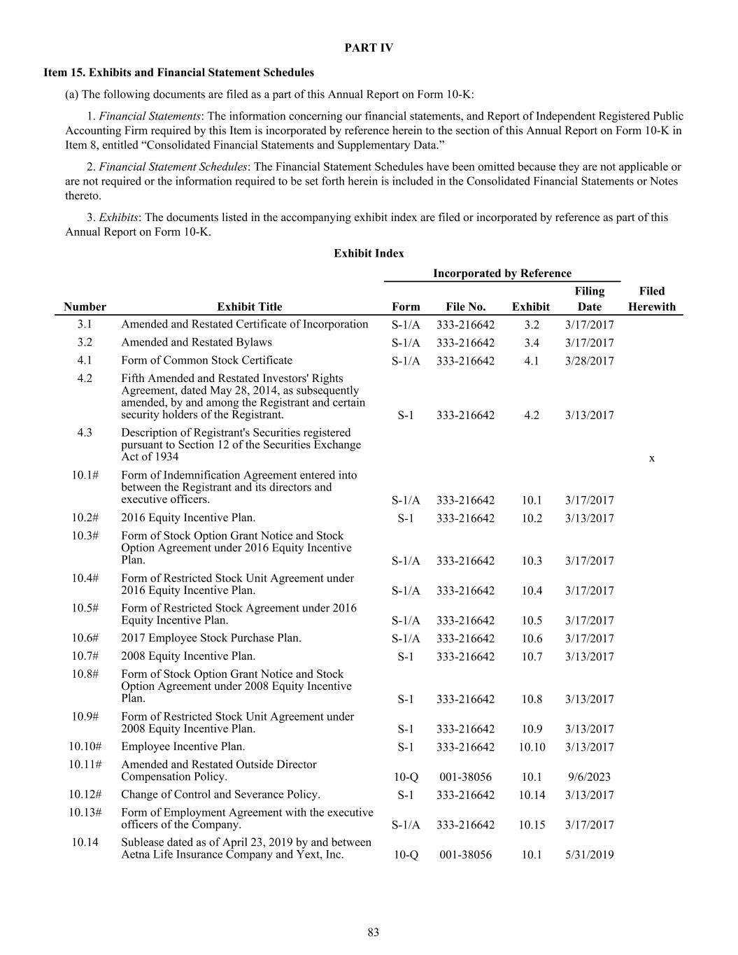 PART IV Item 15. Exhibits and Financial Statement Schedules (a) The following documents are filed as a part of this Annual Report on Form 10-K: 1. Financial Statements: The information concerning our financial statements, and Report of Independent Registered Public Accounting Firm required by this Item is incorporated by reference herein to the section of this Annual Report on Form 10-K in Item 8, entitled “Consolidated Financial Statements and Supplementary Data.” 2. Financial Statement Schedules: The Financial Statement Schedules have been omitted because they are not applicable or are not required or the information required to be set forth herein is included in the Consolidated Financial Statements or Notes thereto. 3. Exhibits: The documents listed in the accompanying exhibit index are filed or incorporated by reference as part of this Annual Report on Form 10-K. Exhibit Index Incorporated by Reference Number Exhibit Title Form File No. Exhibit Filing Date Filed Herewith 3.1 Amended and Restated Certificate of Incorporation S-1/A 333-216642 3.2 3/17/2017 3.2 Amended and Restated Bylaws S-1/A 333-216642 3.4 3/17/2017 4.1 Form of Common Stock Certificate S-1/A 333-216642 4.1 3/28/2017 4.2 Fifth Amended and Restated Investors' Rights Agreement, dated May 28, 2014, as subsequently amended, by and among the Registrant and certain security holders of the Registrant. S-1 333-216642 4.2 3/13/2017 4.3 Description of Registrant's Securities registered pursuant to Section 12 of the Securities Exchange Act of 1934 x 10.1# Form of Indemnification Agreement entered into between the Registrant and its directors and executive officers. S-1/A 333-216642 10.1 3/17/2017 10.2# 2016 Equity Incentive Plan. S-1 333-216642 10.2 3/13/2017 10.3# Form of Stock Option Grant Notice and Stock Option Agreement under 2016 Equity Incentive Plan. S-1/A 333-216642 10.3 3/17/2017 10.4# Form of Restricted Stock Unit Agreement under 2016 Equity Incentive Plan. S-1/A 333-216642 10.4 3/17/2017 10.5# Form of Restricted Stock Agreement under 2016 Equity Incentive Plan. S-1/A 333-216642 10.5 3/17/2017 10.6# 2017 Employee Stock Purchase Plan. S-1/A 333-216642 10.6 3/17/2017 10.7# 2008 Equity Incentive Plan. S-1 333-216642 10.7 3/13/2017 10.8# Form of Stock Option Grant Notice and Stock Option Agreement under 2008 Equity Incentive Plan. S-1 333-216642 10.8 3/13/2017 10.9# Form of Restricted Stock Unit Agreement under 2008 Equity Incentive Plan. S-1 333-216642 10.9 3/13/2017 10.10# Employee Incentive Plan. S-1 333-216642 10.10 3/13/2017 10.11# Amended and Restated Outside Director Compensation Policy. 10-Q 001-38056 10.1 9/6/2023 10.12# Change of Control and Severance Policy. S-1 333-216642 10.14 3/13/2017 10.13# Form of Employment Agreement with the executive officers of the Company. S-1/A 333-216642 10.15 3/17/2017 10.14 Sublease dated as of April 23, 2019 by and between Aetna Life Insurance Company and Yext, Inc. 10-Q 001-38056 10.1 5/31/2019 83