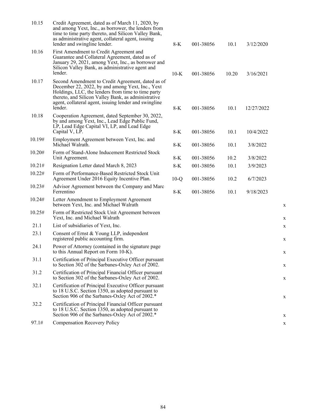 10.15 Credit Agreement, dated as of March 11, 2020, by and among Yext, Inc., as borrower, the lenders from time to time party thereto, and Silicon Valley Bank, as administrative agent, collateral agent, issuing lender and swingline lender. 8-K 001-38056 10.1 3/12/2020 10.16 First Amendment to Credit Agreement and Guarantee and Collateral Agreement, dated as of January 29, 2021, among Yext, Inc., as borrower and Silicon Valley Bank, as administrative agent and lender. 10-K 001-38056 10.20 3/16/2021 10.17 Second Amendment to Credit Agreement, dated as of December 22, 2022, by and among Yext, Inc., Yext Holdings, LLC, the lenders from time to time party thereto, and Silicon Valley Bank, as administrative agent, collateral agent, issuing lender and swingline lender. 8-K 001-38056 10.1 12/27/2022 10.18 Cooperation Agreement, dated September 30, 2022, by and among Yext, Inc., Lead Edge Public Fund, LP, Lead Edge Capital VI, LP, and Lead Edge Capital V, LP. 8-K 001-38056 10.1 10/4/2022 10.19# Employment Agreement between Yext, Inc. and Michael Walrath. 8-K 001-38056 10.1 3/8/2022 10.20# Form of Stand-Alone Inducement Restricted Stock Unit Agreement. 8-K 001-38056 10.2 3/8/2022 10.21# Resignation Letter dated March 8, 2023 8-K 001-38056 10.1 3/9/2023 10.22# Form of Performance-Based Restricted Stock Unit Agreement Under 2016 Equity Incentive Plan. 10-Q 001-38056 10.2 6/7/2023 10.23# Advisor Agreement between the Company and Marc Ferrentino 8-K 001-38056 10.1 9/18/2023 10.24# Letter Amendment to Employment Agreement between Yext, Inc. and Michael Walrath x 10.25# Form of Restricted Stock Unit Agreement between Yext, Inc. and Michael Walrath x 21.1 List of subsidiaries of Yext, Inc. x 23.1 Consent of Ernst & Young LLP, independent registered public accounting firm. x 24.1 Power of Attorney (contained in the signature page to this Annual Report on Form 10-K). x 31.1 Certification of Principal Executive Officer pursuant to Section 302 of the Sarbanes-Oxley Act of 2002. x 31.2 Certification of Principal Financial Officer pursuant to Section 302 of the Sarbanes-Oxley Act of 2002. x 32.1 Certification of Principal Executive Officer pursuant to 18 U.S.C. Section 1350, as adopted pursuant to Section 906 of the Sarbanes-Oxley Act of 2002.* x 32.2 Certification of Principal Financial Officer pursuant to 18 U.S.C. Section 1350, as adopted pursuant to Section 906 of the Sarbanes-Oxley Act of 2002.* x 97.1# Compensation Recovery Policy x 84