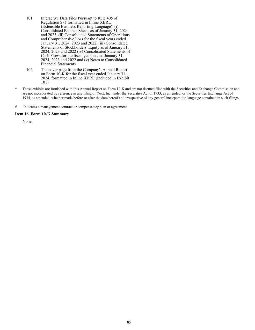 101 Interactive Data Files Pursuant to Rule 405 of Regulation S-T formatted in Inline XBRL (Extensible Business Reporting Language): (i) Consolidated Balance Sheets as of January 31, 2024 and 2023, (ii) Consolidated Statements of Operations and Comprehensive Loss for the fiscal years ended January 31, 2024, 2023 and 2022, (iii) Consolidated Statements of Stockholders' Equity as of January 31, 2024, 2023 and 2022 (iv) Consolidated Statements of Cash Flows for the fiscal years ended January 31, 2024, 2023 and 2022 and (v) Notes to Consolidated Financial Statements 104 The cover page from the Company's Annual Report on Form 10-K for the fiscal year ended January 31, 2024, formatted in Inline XBRL (included in Exhibit 101). * These exhibits are furnished with this Annual Report on Form 10-K and are not deemed filed with the Securities and Exchange Commission and are not incorporated by reference in any filing of Yext, Inc. under the Securities Act of 1933, as amended, or the Securities Exchange Act of 1934, as amended, whether made before or after the date hereof and irrespective of any general incorporation language contained in such filings. # Indicates a management contract or compensatory plan or agreement. Item 16. Form 10-K Summary None. 85