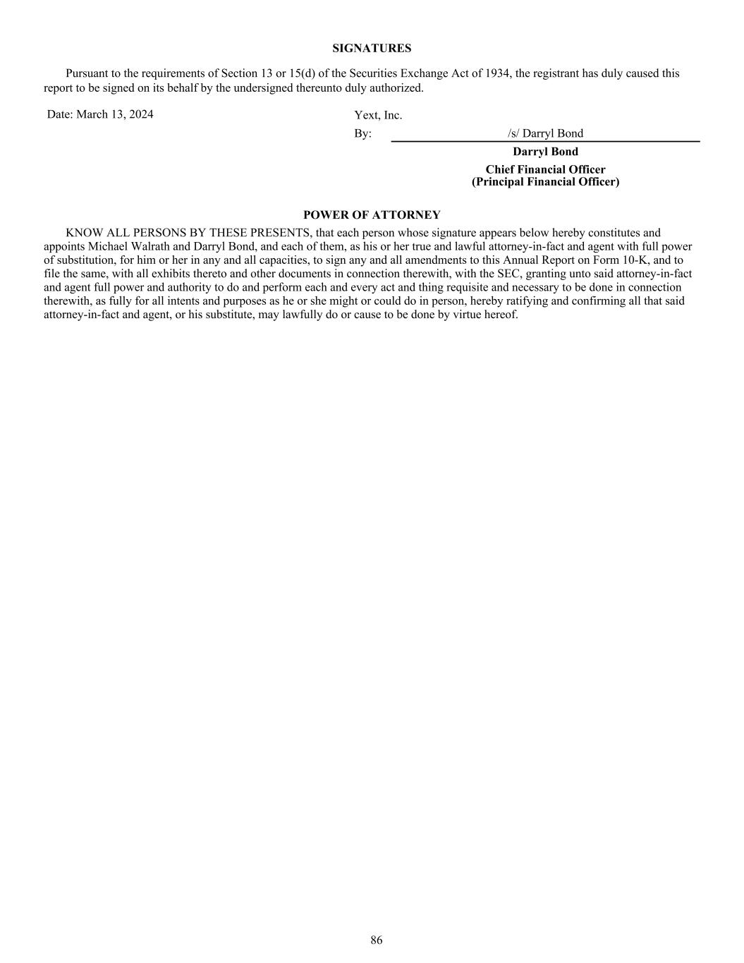SIGNATURES Pursuant to the requirements of Section 13 or 15(d) of the Securities Exchange Act of 1934, the registrant has duly caused this report to be signed on its behalf by the undersigned thereunto duly authorized. Date: March 13, 2024 Yext, Inc. By: /s/ Darryl Bond Darryl Bond Chief Financial Officer (Principal Financial Officer) POWER OF ATTORNEY KNOW ALL PERSONS BY THESE PRESENTS, that each person whose signature appears below hereby constitutes and appoints Michael Walrath and Darryl Bond, and each of them, as his or her true and lawful attorney-in-fact and agent with full power of substitution, for him or her in any and all capacities, to sign any and all amendments to this Annual Report on Form 10-K, and to file the same, with all exhibits thereto and other documents in connection therewith, with the SEC, granting unto said attorney-in-fact and agent full power and authority to do and perform each and every act and thing requisite and necessary to be done in connection therewith, as fully for all intents and purposes as he or she might or could do in person, hereby ratifying and confirming all that said attorney-in-fact and agent, or his substitute, may lawfully do or cause to be done by virtue hereof. 86
