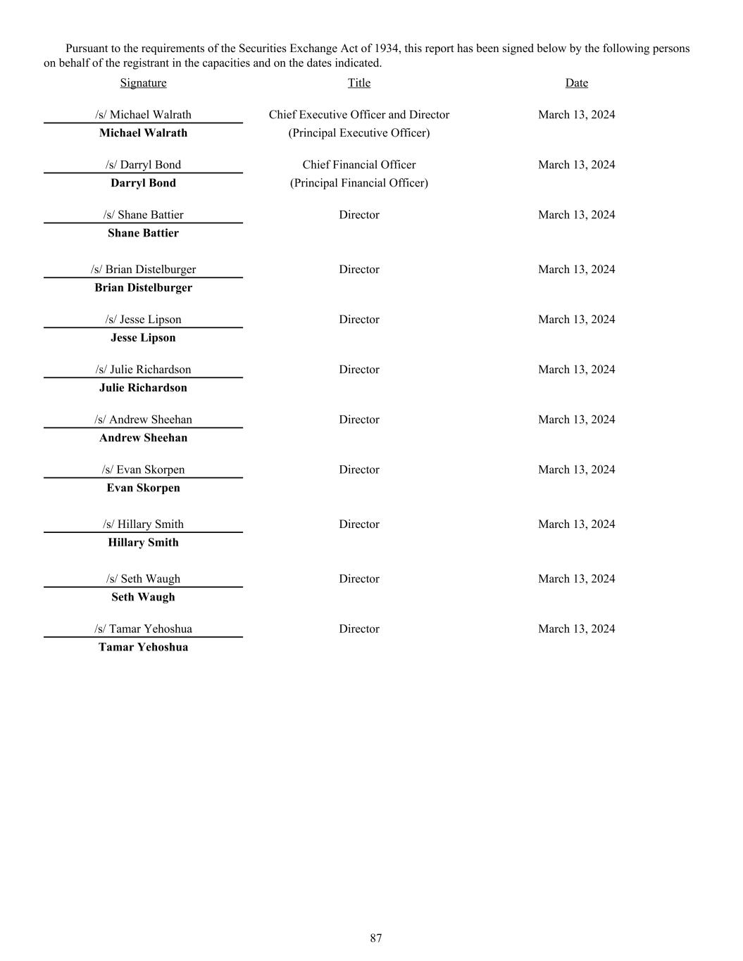 Pursuant to the requirements of the Securities Exchange Act of 1934, this report has been signed below by the following persons on behalf of the registrant in the capacities and on the dates indicated. Signature Title Date /s/ Michael Walrath Chief Executive Officer and Director March 13, 2024 Michael Walrath (Principal Executive Officer) /s/ Darryl Bond Chief Financial Officer March 13, 2024 Darryl Bond (Principal Financial Officer) /s/ Shane Battier Director March 13, 2024 Shane Battier /s/ Brian Distelburger Director March 13, 2024 Brian Distelburger /s/ Jesse Lipson Director March 13, 2024 Jesse Lipson /s/ Julie Richardson Director March 13, 2024 Julie Richardson /s/ Andrew Sheehan Director March 13, 2024 Andrew Sheehan /s/ Evan Skorpen Director March 13, 2024 Evan Skorpen /s/ Hillary Smith Director March 13, 2024 Hillary Smith /s/ Seth Waugh Director March 13, 2024 Seth Waugh /s/ Tamar Yehoshua Director March 13, 2024 Tamar Yehoshua 87