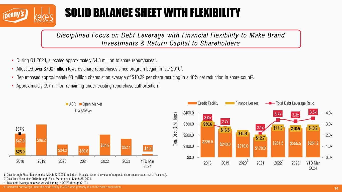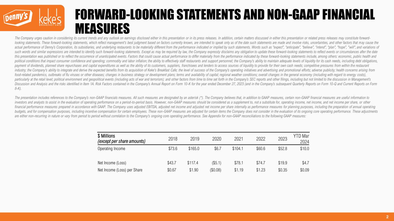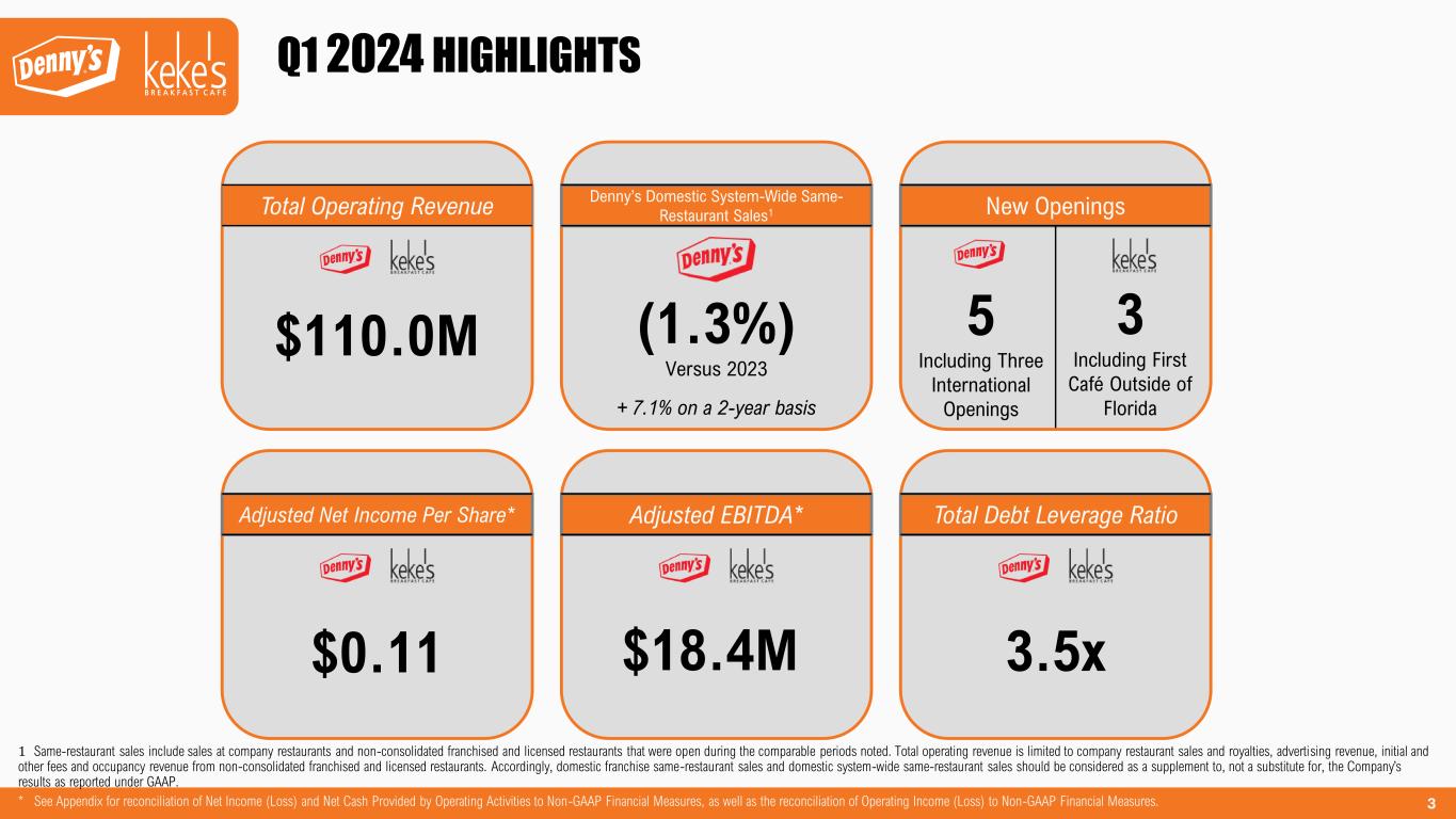 2 The Company urges caution in considering its current trends and any outlook on earnings disclosed either in this presentation or in its press releases. In addition, certain matters discussed in either this presentation or related press releases may constitute forward- looking statements. These forward-looking statements, which reflect management's best judgment based on factors currently known, are intended to speak only as of the date such statements are made and involve risks, uncertainties, and other factors that may cause the actual performance of Denny’s Corporation, its subsidiaries, and underlying restaurants to be materially different from the performance indicated or implied by such statements. Words such as “expect”, “anticipate”, “believe”, “intend”, “plan”, “hope”, "will", and variations of such words and similar expressions are intended to identify such forward-looking statements. Except as may be required by law, the Company expressly disclaims any obligation to update these forward-looking statements to reflect events or circumstances after the date this presentation was published or to reflect the occurrence of unanticipated events. Factors that could cause actual performance to differ materially from the performance indicated by these forward-looking statements include, among others: economic, public health and political conditions that impact consumer confidence and spending; commodity and labor inflation; the ability to effectively staff restaurants and support personnel; the Company's ability to maintain adequate levels of liquidity for its cash needs, including debt obligations, payment of dividends, planned share repurchases and capital expenditures as well as the ability of its customers, suppliers, franchisees and lenders to access sources of liquidity to provide for their own cash needs; competitive pressures from within the restaurant industry; the Company's ability to integrate and derive the expected benefits from its acquisition of Keke's Breakfast Cafe; the level of success of the Company’s operating initiatives and advertising and promotional efforts; adverse publicity; health concerns arising from food-related pandemics, outbreaks of flu viruses or other diseases; changes in business strategy or development plans; terms and availability of capital; regional weather conditions; overall changes in the general economy (including with regard to energy costs), particularly at the retail level; political environment and geopolitical events (including acts of war and terrorism); and other factors from time to time set forth in the Company’s SEC reports and other filings, including but not limited to the discussion in Management’s Discussion and Analysis and the risks identified in Item 1A. Risk Factors contained in the Company’s Annual Report on Form 10-K for the year ended December 27, 2023 (and in the Company’s subsequent Quarterly Reports on Form 10-Q and Current Reports on Form 8-K). The presentation includes references to the Company’s non-GAAP financials measures. All such measures are designated by an asterisk (*). The Company believes that, in addition to GAAP measures, certain non-GAAP financial measures are useful information to investors and analysts to assist in the evaluation of operating performance on a period-to-period basis. However, non-GAAP measures should be considered as a supplement to, not a substitute for, operating income, net income, and net income per share, or other financial performance measures prepared in accordance with GAAP. The Company uses adjusted EBITDA, adjusted net income and adjusted net income per share internally as performance measures for planning purposes, including the preparation of annual operating budgets, and for compensation purposes, including incentive compensation for certain employees. These non-GAAP measures are adjusted for certain items the Company does not consider in the evaluation of its ongoing core operating performance. These adjustments are either non-recurring in nature or vary from period to period without correlation to the Company's ongoing core operating performance. See Appendix for non-GAAP reconciliations to the following GAAP measures: FORWARD-LOOKING STATEMENTS AND NON-GAAP FINANCIAL MEASURES $ Millions (except per share amounts) 2018 2019 2020 2021 2022 2023 YTD Mar 2024 Operating Income $73.6 $165.0 $6.7 $104.1 $60.6 $52.8 $10.0 Net Income (Loss) $43.7 $117.4 ($5.1) $78.1 $74.7 $19.9 $4.7 Net Income (Loss) per Share $0.67 $1.90 ($0.08) $1.19 $1.23 $0.35 $0.09