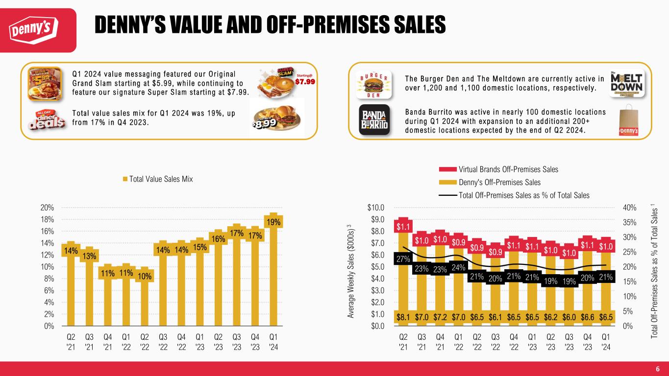 5 DENNY’S DOMESTIC SALES $9.2 $8.0 $8.1 $7.9 $7.4 $7.1 $7.6 $7.5 $7.2 $7.0 $7.6 $7.5 $25.3 $26.2 $27.0 $25.2 $28.3 $28.1 $28.9 $29.1 $30.3 $29.6 $30.0 $29.2 $34.5 $34.3 $35.2 $33.1 $35.7 $35.1 $36.5 $36.7 $37.5 $36.5 $37.7 $36.8 -1% 0% 1% -2% 2% 2% 3% 8% 3% 2% 1% -1% -5% -3% -1% 1% 3% 5% 7% 9% $0.0 $5.0 $10.0 $15.0 $20.0 $25.0 $30.0 $35.0 $40.0 Q2 '21 Q3 '21 Q4 '21 Q1 '22 Q2 '22 Q3 '22 Q4 '22 Q1 '23 Q2 '23 Q3 '23 Q4 '23 Q1 '24 D om es tic S ys te m -W id e S am e- R es ta ur an t S al es 1 A ve ra ge W ee kl y S al es ( $0 00 s) 3 Denny's On-Premises Sales Denny's Total Off-Premises Sales Denny's Total Sales Denny's Domestic System-Wide Same-Restaurant Sales 1 Same-restaurant sales include sales at company restaurants and non-consolidated franchised and licensed restaurants that were open during the comparable periods noted. Total operating revenue is limited to company restaurant sales and royalties, advertising revenue, initial and other fees and occupancy revenue from non-consolidated franchised and licensed restaurants. Accordingly, domestic franchise same-restaurant sales and domestic system-wide same-restaurant sales should be considered as a supplement to, not a substitute for, the Company’s results as reported under GAAP. 2 2021 and 2022 Denny’s domestic system-wide same-restaurant sales1 are versus 2019. 3 Domestic average weekly sales reflect sales for company and franchised restaurants on Denny’s proprietary point of sale (POS) system. 4 Data for the Fiscal First Quarter 2024. 1, 2 69% 53% 25% 38%31% 47% 75% 62% 0% 20% 40% 60% 80% Dine In Off-Premise The Burger Den The Meltdown Sales Mix by Daypart4 Breakfast & Lunch Dinner & Late-Night 59% 63% 67% 68% 41% 37% 33% 32% 0% 20% 40% 60% 80% Dine In Off-Premise The Burger Den The Meltdown Sales Mix Weekday vs. Weekend4 Weekday Weekend Denny’s Q1 2024 Domestic Average Weekly Sales of Approximately $36,800.