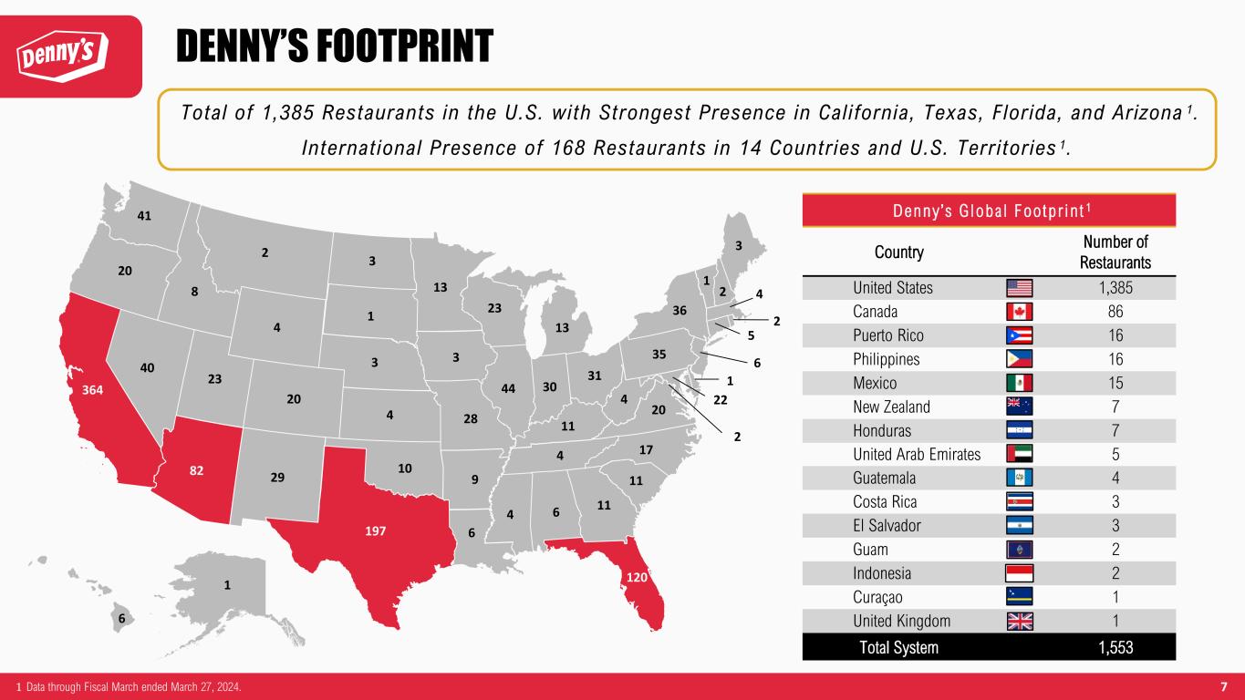 6 DENNY’S VALUE AND OFF-PREMISES SALES $8.1 $7.0 $7.2 $7.0 $6.5 $6.1 $6.5 $6.5 $6.2 $6.0 $6.6 $6.5 $1.1 $1.0 $1.0 $0.9 $0.9 $0.9 $1.1 $1.1 $1.0 $1.0 $1.1 $1.0 27% 23% 23% 24% 21% 20% 21% 21% 19% 19% 20% 21% 0% 5% 10% 15% 20% 25% 30% 35% 40% $0.0 $1.0 $2.0 $3.0 $4.0 $5.0 $6.0 $7.0 $8.0 $9.0 $10.0 Q2 '21 Q3 '21 Q4 '21 Q1 '22 Q2 '22 Q3 '22 Q4 '22 Q1 '23 Q2 '23 Q3 '23 Q4 '23 Q1 '24 To ta l O ff- P re m is es S al es a s % o f T ot al S al es 1 A ve ra ge W ee kl y S al es ( $0 00 s) 3 Virtual Brands Off-Premises Sales Denny's Off-Premises Sales Total Off-Premises Sales as % of Total Sales The Bu r ger Den and The Me l t down a r e cu r ren t l y a c t i ve in o v e r 1 , 200 and 1 ,100 domes t i c l o c a t ions , r e spec t i ve l y . Banda Bu r r i to wa s a c t ive i n nea r ly 100 domes t ic l o c a t ions du r ing Q1 2024 w i th expans ion t o a n a dd i t i ona l 200+ domes t ic l o ca t ions expec ted by t he end o f Q2 2024 . To ta l v a lue s a les m i x f o r Q1 2024 wa s 19% , up f r om 17% i n Q4 2023 . Q1 2024 v a lue messag ing f e a tu red ou r O r ig ina l Grand S lam s t a r t ing a t $5 .99 , wh i l e con t inu ing t o f e a tu re ou r s i gna tu re Super S lam s t a r t ing a t $7 .99 . Starting@ $7.99 14% 13% 11% 11% 10% 14% 14% 15% 16% 17% 17% 19% 0% 2% 4% 6% 8% 10% 12% 14% 16% 18% 20% Q2 '21 Q3 '21 Q4 '21 Q1 '22 Q2 '22 Q3 '22 Q4 '22 Q1 '23 Q2 '23 Q3 '23 Q4 '23 Q1 '24 Total Value Sales Mix