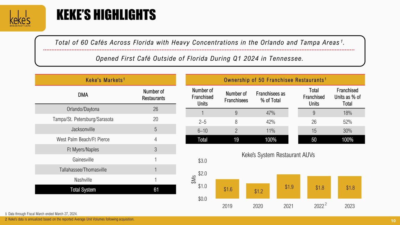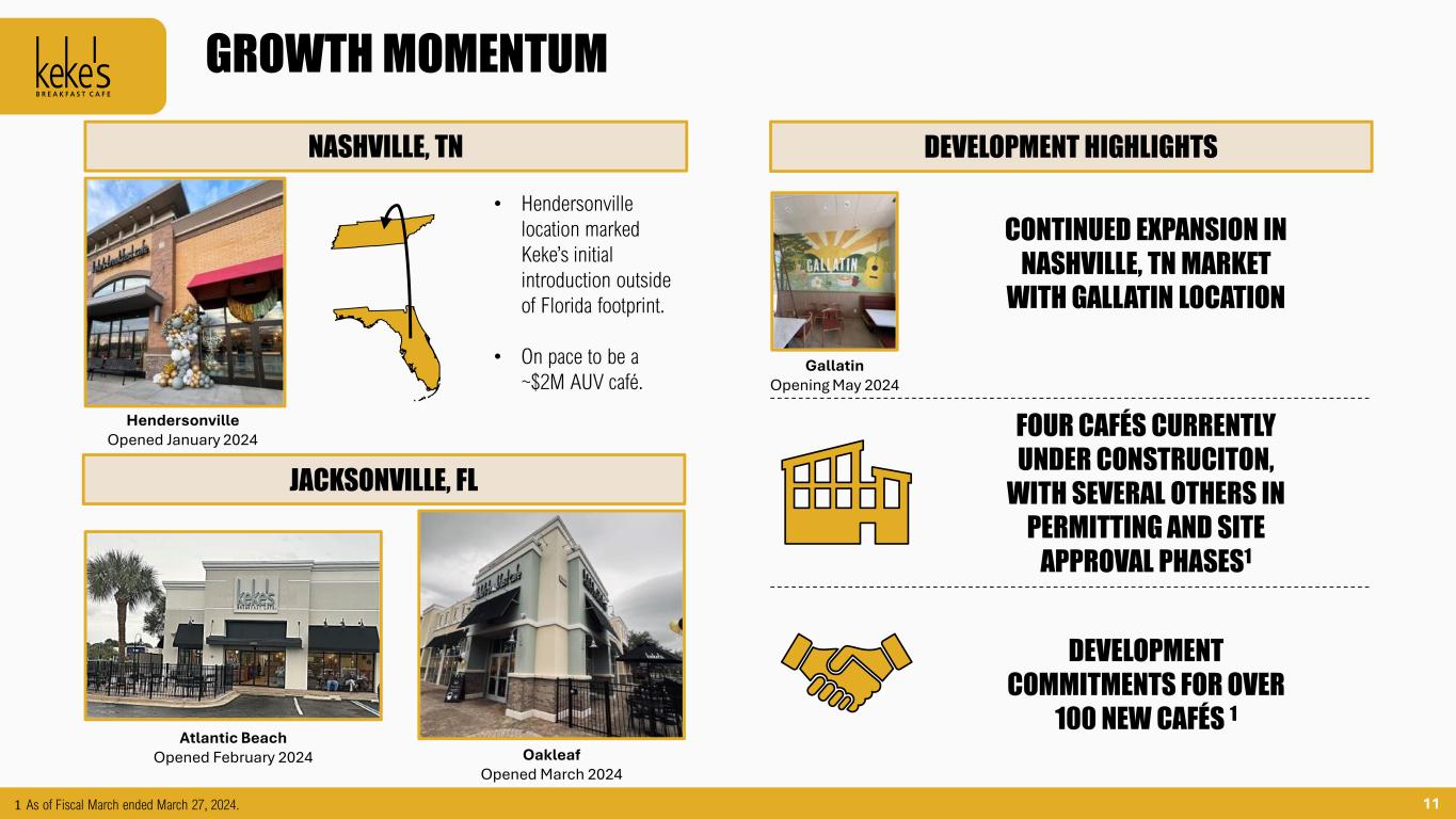 10 KEKE’S HIGHLIGHTS Total of 60 Cafés Across Florida with Heavy Concentrations in the Orlando and Tampa Areas 1. Opened First Café Outside of Florida During Q1 2024 in Tennessee. 1 Data through Fiscal March ended March 27, 2024. 2 Keke’s data is annualized based on the reported Average Unit Volumes following acquisition. Ownersh ip o f 50 F r anch i see Res t au r an t s 1 Number of Franchised Units Number of Franchisees Franchisees as % of Total Total Franchised Units Franchised Units as % of Total 1 9 47% 9 18% 2–5 8 42% 26 52% 6–10 2 11% 15 30% Total 19 100% 50 100% $1.6 $1.2 $1.9 $1.8 $1.8 $0.0 $1.0 $2.0 $3.0 2019 2020 2021 2022 2023 $M s Keke’s System Restaurant AUVs 2 Keke ’ s Mar ke t s 1 DMA Number of Restaurants Orlando/Daytona 26 Tampa/St. Petersburg/Sarasota 20 Jacksonville 5 West Palm Beach/Ft Pierce 4 Ft Myers/Naples 3 Gainesville 1 Tallahassee/Thomasville 1 Nashville 1 Total System 61