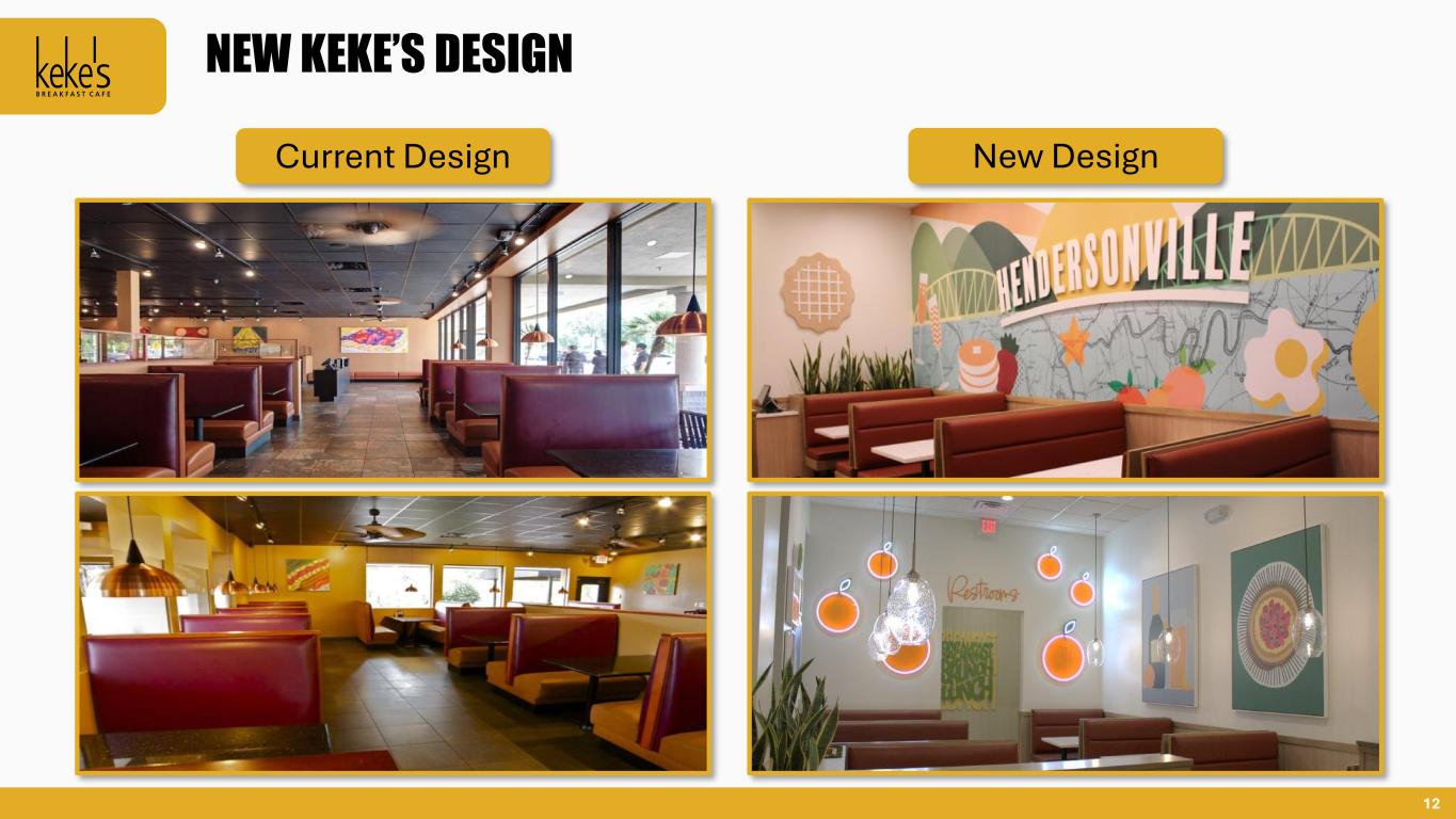 11 GROWTH MOMENTUM DEVELOPMENT HIGHLIGHTS • Hendersonville location marked Keke’s initial introduction outside of Florida footprint. • On pace to be a ~$2M AUV café. Hendersonville Opened January 2024 NASHVILLE, TN JACKSONVILLE, FL Oakleaf Opened March 2024 Atlantic Beach Opened February 2024 DEVELOPMENT COMMITMENTS FOR OVER 100 NEW CAFÉS 1 CONTINUED EXPANSION IN NASHVILLE, TN MARKET WITH GALLATIN LOCATION Gallatin Opening May 2024 FOUR CAFÉS CURRENTLY UNDER CONSTRUCITON, WITH SEVERAL OTHERS IN PERMITTING AND SITE APPROVAL PHASES1 1 As of Fiscal March ended March 27, 2024.
