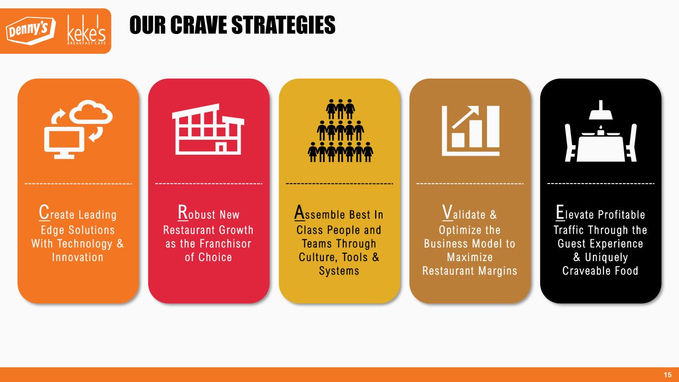 14 $286.5 $240.0 $210.0 $170.0 $261.5 $255.5 $261.2 $30.6 $16.5 $15.4 $12.7 $11.2 $10.5 $10.2 3.0x 2.7x 2.1x 3.4x 3.3x 3.5x 0.0x 1.0x 2.0x 3.0x 4.0x 2018 2019 2020 2021 2022 2023 YTD Mar 2024 $0.0 $100.0 $200.0 $300.0 $400.0 To ta l D eb t ( $ M ill io ns ) Credit Facility Finance Leases Total Debt Leverage Ratio 3 SOLID BALANCE SHEET WITH FLEXIBILITY $25.0 $42.9 $96.2 $34.2 $30.6 $64.9 $52.1 $4.8 $67.9 2018 2019 2020 2021 2022 2023 YTD Mar 2024 ASR Open Market $ In Millions Disciplined Focus on Debt Leverage with Financial Flexibility to Make Brand Investments & Return Capital to Shareholders • During Q1 2024, allocated approximately $4.8 million to share repurchases1. • Allocated over $700 million towards share repurchases since program began in late 20102. • Repurchased approximately 68 million shares at an average of $10.39 per share resulting in a 48% net reduction in share count2. • Approximately $97 million remaining under existing repurchase authorization1. 4 1 Data through Fiscal March ended March 27, 2024. Includes 1% excise tax on the value of corporate share repurchases (net of issuance). 2 Data from November 2010 through Fiscal March ended March 27, 2024. 3 Total debt leverage ratio was waived starting in Q2 ’20 through Q1 ‘21. 4 Increased borrowings under the credit facility in 2022 were primarily due to the Keke’s acquisition.