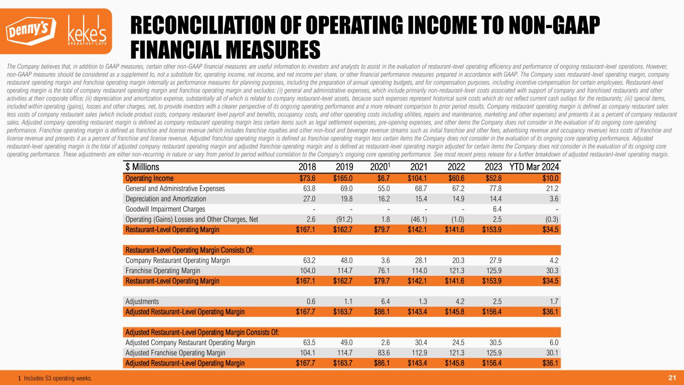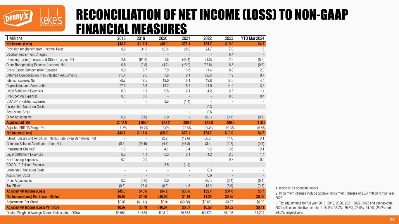 20 $ Millions 2018 2019 20201 2021 2022 2023 YTD Mar 2024 Net Income (Loss) $43.7 $117.4 ($5.1) $78.1 $74.7 $19.9 $4.7 Provision for (Benefit from) Income Taxes 8.6 31.8 (2.0) 26.0 24.7 7.0 1.5 Goodwill Impairment Charges - - - - - 6.4 - Operating (Gains) Losses and Other Charges, Net 2.6 (91.2) 1.8 (46.1) (1.0) 2.5 (0.3) Other Nonoperating Expense (Income), Net 0.6 (2.8) (4.2) (15.2) (52.6) 8.3 (0.6) Share‐Based Compensation Expense 6.0 6.7 7.9 13.6 11.4 8.9 2.8 Deferred Compensation Plan Valuation Adjustments (1.0) 2.6 1.6 2.1 (2.2) 1.9 0.7 Interest Expense, Net 20.7 18.5 18.0 15.1 13.8 17.6 4.4 Depreciation and Amortization 27.0 19.8 16.2 15.4 14.9 14.4 3.6 Legal Settlement Expenses 0.3 1.1 0.5 2.1 4.2 2.3 1.4 Pre-Opening Expenses 0.1 0.0 - - - 0.3 0.4 COVID-19 Related Expenses - - 3.5 (1.4) - - - Leadership Transition Costs - - - - 0.3 - - Acquisition Costs - - - - 0.6 - - Other Adjustments 0.2 (0.0) 0.0 - (0.1) (0.1) (0.1) Adjusted EBITDA $108.8 $104.0 $38.2 $89.8 $88.8 $89.4 $18.4 Adjusted EBITDA Margin % 17.3% 19.2% 13.0% 22.6% 19.4% 19.3% 16.8% Net Income (Loss) $43.7 $117.4 ($5.1) $78.1 $74.7 $19.9 $4.7 (Gains) Losses and Amort. on Interest Rate Swap Derivatives, Net - - (2.2) (12.6) (55.0) 11.0 0.1 Gains on Sales of Assets and Other, Net (0.5) (93.6) (4.7) (47.8) (3.4) (2.2) (0.6) Impairment Charges2 1.6 - 4.1 0.4 1.0 8.6 0.1 Legal Settlement Expenses 0.3 1.1 0.5 2.1 4.2 2.3 1.4 Pre-Opening Expenses 0.1 0.0 - - - 0.3 0.4 COVID-19 Related Expenses - - 3.5 (1.4) - - - Leadership Transition Costs - - - - 0.3 - - Acquisition Costs - - - - 0.6 - - Other Adjustments 0.2 (0.0) 0.0 - (0.1) (0.1) (0.1) Tax Effect3 (0.3) 23.8 (0.3) 14.8 13.0 (5.0) (0.3) Adjusted Net Income (Loss) $45.0 $48.6 ($4.2) $33.6 $35.4 $34.8 $5.7 Net Income (Loss) Per Share - Diluted $0.67 $1.90 ($0.08) $1.19 $1.23 $0.35 $0.09 Adjustments Per Share $0.02 ($1.11) $0.01 ($0.68) ($0.65) $0.27 $0.02 Adjusted Net Income (Loss) Per Share $0.69 $0.79 ($0.07) $0.51 $0.58 $0.62 $0.11 Diluted Weighted Average Shares Outstanding (000’s) 65,562 61,833 60,812 65,573 60,879 56,196 53,214 RECONCILIATION OF NET INCOME (LOSS) TO NON-GAAP FINANCIAL MEASURES 1 Includes 53 operating weeks. 2 Impairment charges include goodwill impairment charges of $6.4 million for full year 2023. 3 Tax adjustments for full year 2018, 2019, 2020, 2021, 2022, 2023 and year-to-date 2024 reflect an effective tax rate of 16.4%, 25.7%, 25.6%, 25.0%, 24.9%, 25.0% and 24.6%, respectively.