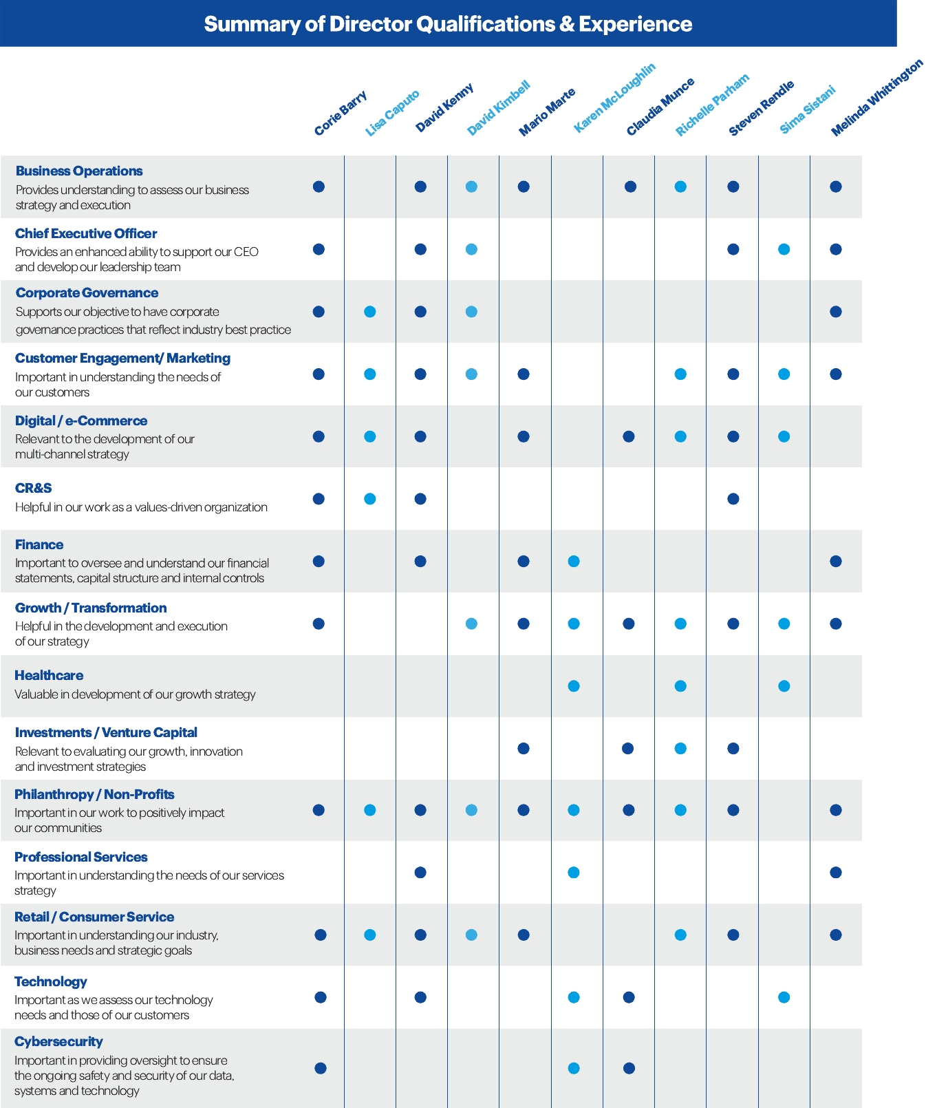 | | | | We have eleven director nominees standing for election this year. More information about our nominees’ qualifications and experience can be found starting on page 26. | | | | ||