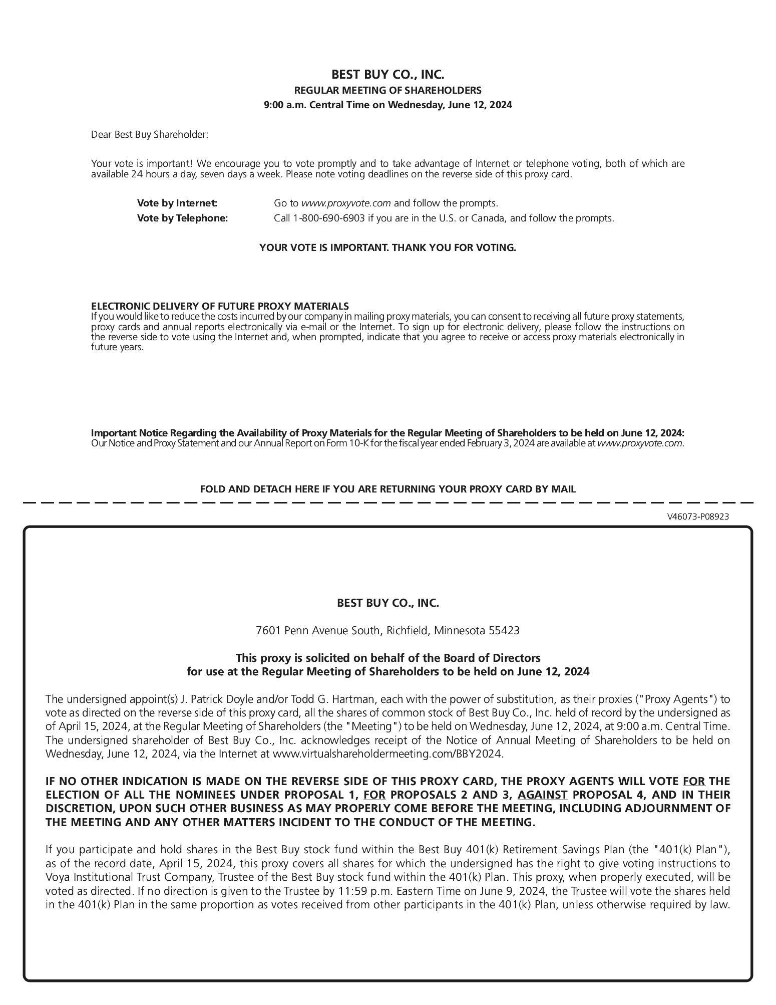 | | Internet: | | | Submit pre-meeting questions online by visiting www.proxyvote.com and attend the Regular Meeting of Shareholders online at www.virtualshareholdermeeting.com/BBY2024 | | |||
