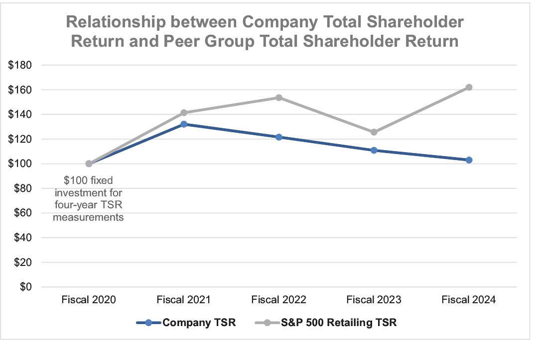 (5) | Total shareholder return as calculated based on a fixed investment of $100 in the Standard & Poor (S&P) 500 Consumer Discretionary Distribution & Retail Index, formerly called the S&P 500 Retailing Group Industry Index (the“S&P 500 Retailing Group”), which is the peer group used for this Pay versus Performance analysis and of which the Company is a component, measured from the market close on January 31, 2020, (the last trading day of our fiscal 2020) through and including the end of the fiscal year for each year reported in the table. |