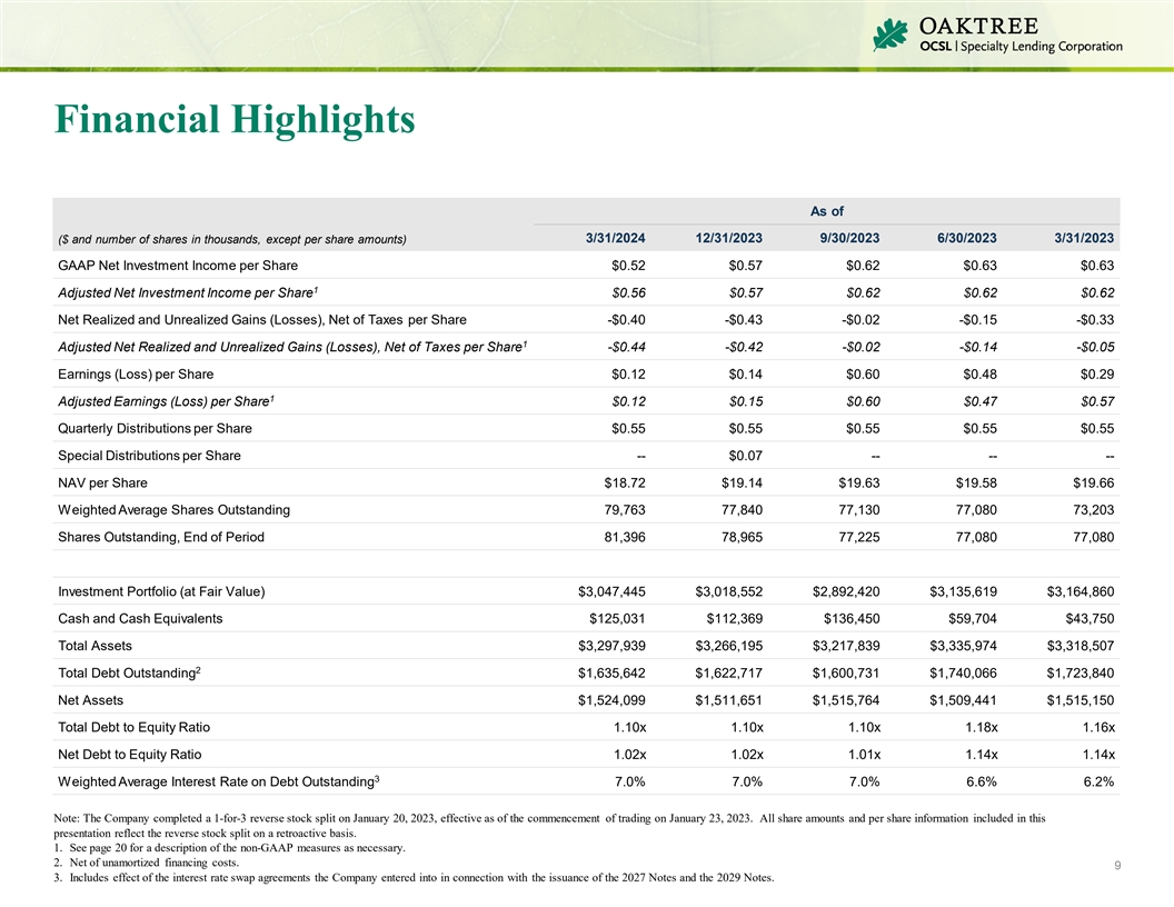 Investment Activity (continued) New Investment Commitment Detail ($ in millions) Security Type Market Investment Number of Second Unsecured Private Primary Secondary Avg. Secondary Fiscal Quarter Commitments Deals First Lien Lien & Other Placement (Public) (Public) Purchase Price 2Q2020 $273 39 $210 $21 $42 $141 $58 $75 83% 3Q2020 $261 18 $177 $8 $76 $154 $71 $35 74% 4Q2020 $148 10 $123 $25 $0.5 $90 $57 $2 96% 1Q2021 $286 21 $196 $90 -- $181 $84 $22 93% 2Q2021 $318 20 $253 $44 $21 $245 $63 $10 93% 3Q2021 $178 10 $141 $25 $12 $104 $70 $5 97% 4Q2021 $385 20 $350 $13 $23 $304 $79 $2 100% 1Q2022 $300 21 $220 $77 $2 $227 $73 -- N/A 2Q2022 $228 25 $163 $17 $48 $162 $26 $40 96% 3Q2022 $132 28 $100 $6 $25 $63 $5 $63 91% 4Q2022 $97 11 $65 -- $32 $71 $22 $4 92% 1Q2023 $250 25 $214 $10 $26 $188 $49 $14 82% 2Q2023 $124 9 $124 -- -- $118 $5 $1 81% 3Q2023 $251 10 $227 $24 $0.2 $224 $20 $7 85% 4Q2023 $87 6 $87 -- -- $76 $12 -- N/A 1Q2024 $370 24 $354 -- $16 $302 -- $68 90% 2Q2024 $396 35 $364 -- $32 $205 $99 $92 98% 8 Note: Numbers may not sum due to rounding. Excludes any positions originated, purchased and sold within the same quarter and the assets acquired in the OSI2 Merger.
