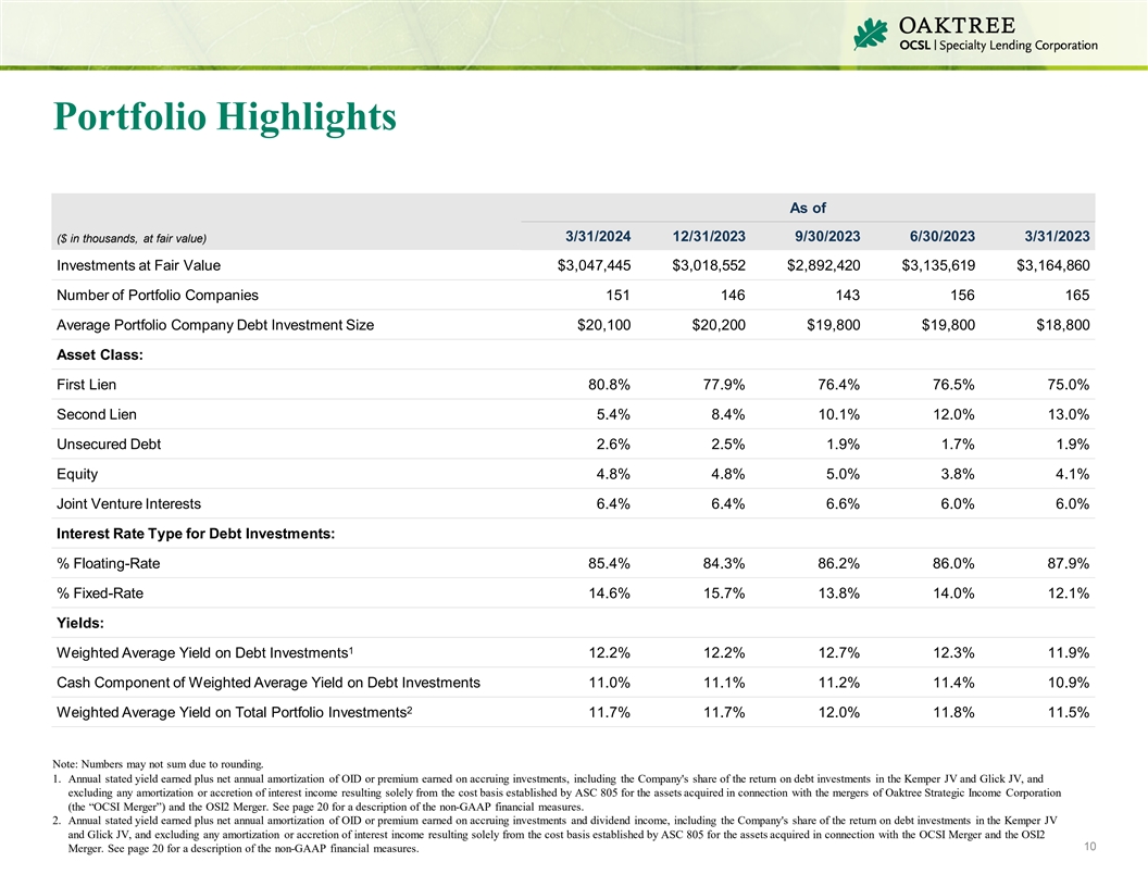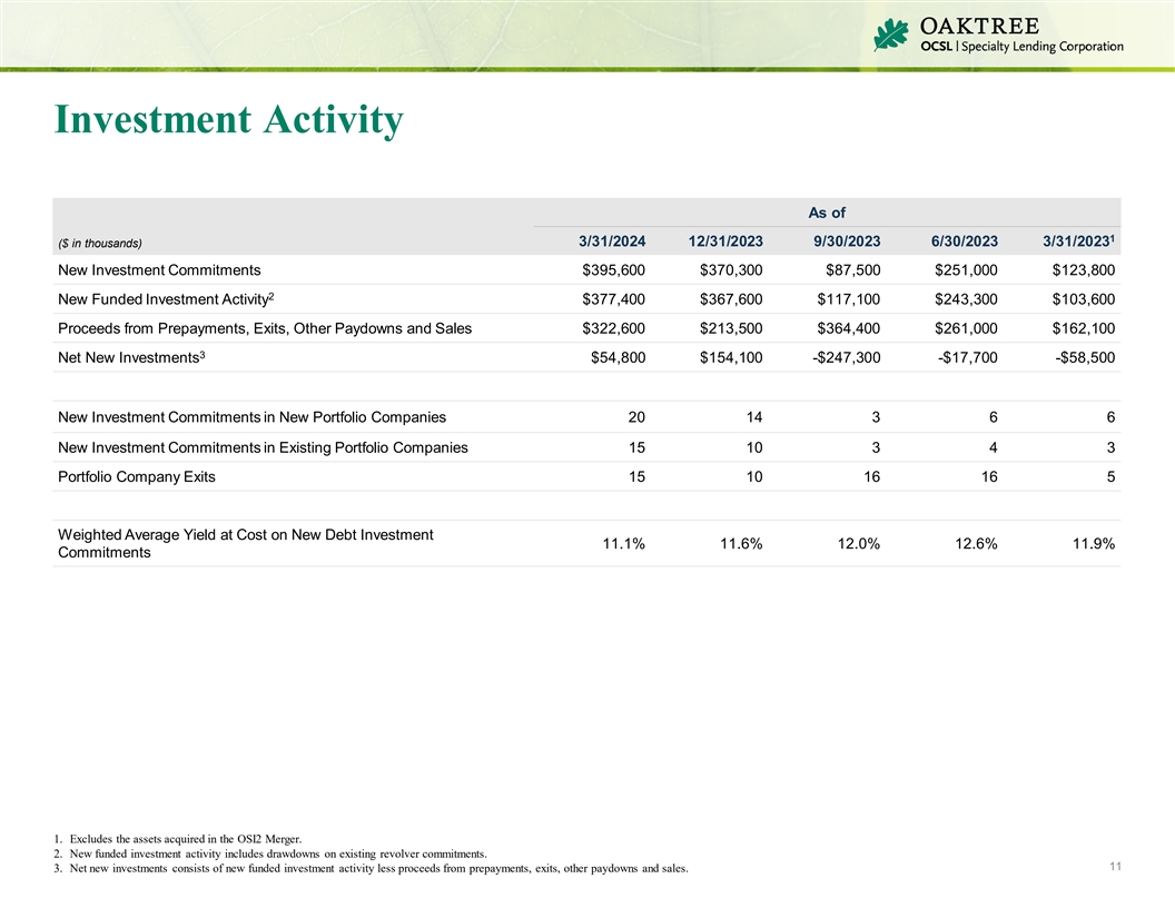 Portfolio Highlights As of ($ in thousands, at fair value) 3/31/2024 12/31/2023 9/30/2023 6/30/2023 3/31/2023 Investments at Fair Value $3,047,445 $3,018,552 $2,892,420 $3,135,619 $3,164,860 Number of Portfolio Companies 151 146 143 156 165 Average Portfolio Company Debt Investment Size $20,100 $20,200 $19,800 $19,800 $18,800 Asset Class: First Lien 80.8% 77.9% 76.4% 76.5% 75.0% Second Lien 5.4% 8.4% 10.1% 12.0% 13.0% Unsecured Debt 2.6% 2.5% 1.9% 1.7% 1.9% Equity 4.8% 4.8% 5.0% 3.8% 4.1% Joint Venture Interests 6.4% 6.4% 6.6% 6.0% 6.0% Interest Rate Type for Debt Investments: % Floating-Rate 85.4% 84.3% 86.2% 86.0% 87.9% % Fixed-Rate 14.6% 15.7% 13.8% 14.0% 12.1% Yields: 1 Weighted Average Yield on Debt Investments 12.2% 12.2% 12.7% 12.3% 11.9% Cash Component of Weighted Average Yield on Debt Investments 11.0% 11.1% 11.2% 11.4% 10.9% 2 Weighted Average Yield on Total Portfolio Investments 11.7% 11.7% 12.0% 11.8% 11.5% Note: Numbers may not sum due to rounding. 1. Annual stated yield earned plus net annual amortization of OID or premium earned on accruing investments, including the Company's share of the return on debt investments in the Kemper JV and Glick JV, and excluding any amortization or accretion of interest income resulting solely from the cost basis established by ASC 805 for the assets acquired in connection with the mergers of Oaktree Strategic Income Corporation (the “OCSI Merger”) and the OSI2 Merger. See page 20 for a description of the non-GAAP financial measures. 2. Annual stated yield earned plus net annual amortization of OID or premium earned on accruing investments and dividend income, including the Company's share of the return on debt investments in the Kemper JV and Glick JV, and excluding any amortization or accretion of interest income resulting solely from the cost basis established by ASC 805 for the assets acquired in connection with the OCSI Merger and the OSI2 10 Merger. See page 20 for a description of the non-GAAP financial measures.