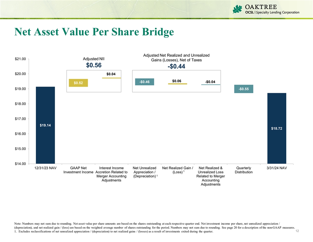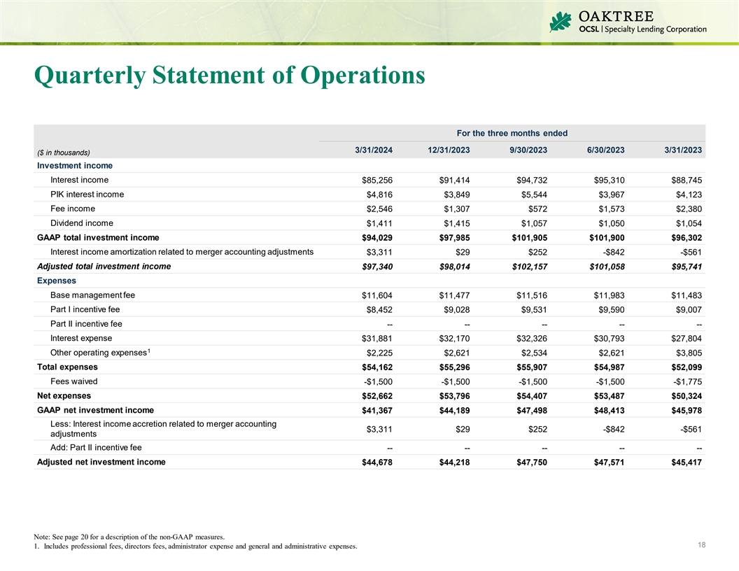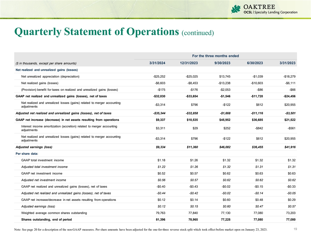 Non-GAAP Disclosures The OCSI Merger and the OSI2 Merger (the “Mergers”) were accounted for as asset acquisitions in accordance with the asset acquisition method of accounting as detailed in ASC 805-50, Business Combinations—Related Issues ( ASC 805 ). The consideration paid to each of the stockholders of OCSI and OSI2 were allocated to the individual assets acquired and liabilities assumed based on the relative fair values of the net identifiable assets acquired other than non-qualifying assets, which established a new cost basis for the acquired investments under ASC 805 that, in aggregate, was different than the historical cost basis of the acquired investments prior to the OCSI Merger or OSI2 Merger, as applicable. Additionally, immediately following the completion of the Mergers, the acquired investments were marked to their respective fair values under ASC 820, Fair Value Measurements, which resulted in unrealized appreciation / depreciation. The new cost basis established by ASC 805 on debt investments acquired will accrete / amortize over the life of each respective debt investment through interest income, with a corresponding adjustment recorded to unrealized appreciation / depreciation on such investment acquired through its ultimate disposition. The new cost basis established by ASC 805 on equity investments acquired will not accrete / amortize over the life of such investments through interest income and, assuming no subsequent change to the fair value of the equity investments acquired and disposition of such equity investments at fair value, the Company will recognize a realized gain / loss with a corresponding reversal of the unrealized appreciation / depreciation on disposition of such equity investments acquired. The Company’s management uses the non-GAAP financial measures described above internally to analyze and evaluate financial results and performance and to compare its financial results with those of other business development companies that have not adjusted the cost basis of certain investments pursuant to ASC 805. The Company’s management believes Adjusted Total Investment Income , Adjusted Total Investment Income Per Share , Adjusted Net Investment Income and Adjusted Net Investment Income Per Share are useful to investors as an additional tool to evaluate ongoing results and trends for the Company without giving effect to the accretion income resulting from the new cost basis of the investments acquired in the Mergers because these amounts do not impact the fees payable to Oaktree under its second amended and restated investment advisory agreement (the “A&R Advisory Agreement”), and specifically as its relates to Adjusted Net Investment Income and Adjusted Net Investment Income Per Share , without giving effect to Part II incentive fees. In addition, the Company’s management believes that “Adjusted Net Realized and Unrealized Gains (Losses), Net of Taxes”, “Adjusted Net Realized and Unrealized Gains (Losses), Net of Taxes Per Share”, “Adjusted Earnings (Loss)” and “Adjusted Earnings (Loss) Per Share” are useful to investors as they exclude the non-cash income/gain resulting from the Mergers and used by management to evaluate the economic earnings of its investment portfolio. Moreover, these metrics align the Company's key financial measures with the calculation of incentive fees payable to Oaktree under with the A&R Advisory Agreement (i.e., excluding amounts resulting solely from the lower cost basis of the acquired investments established by ASC 805 that would have been to the benefit of Oaktree absent such exclusion). 20 I n v e s t o r P r e s e n a t