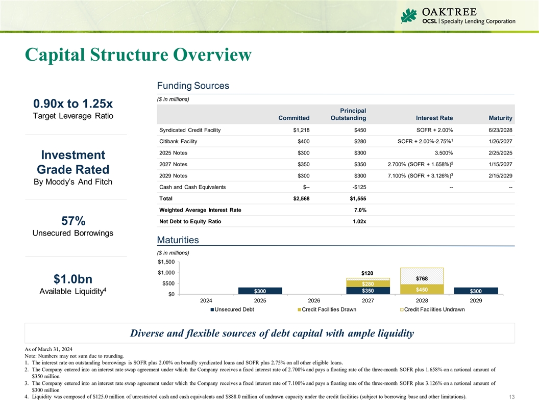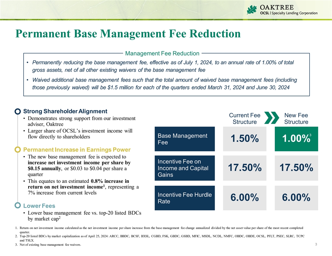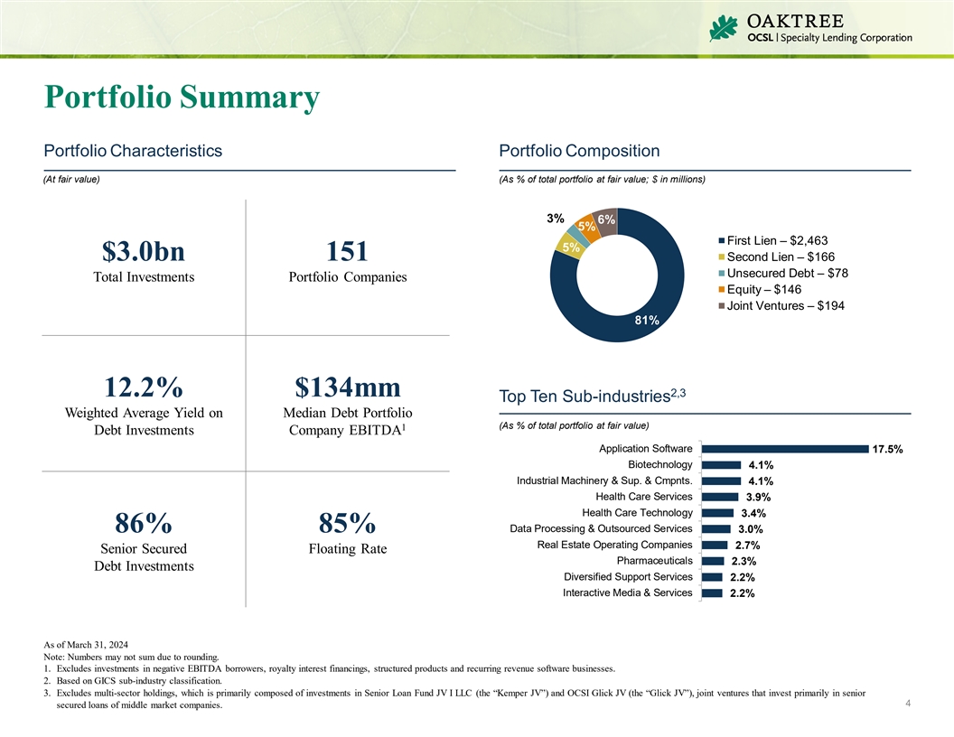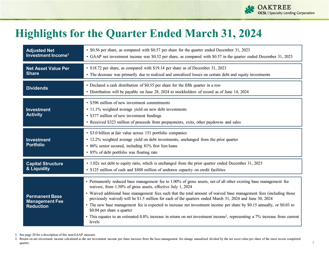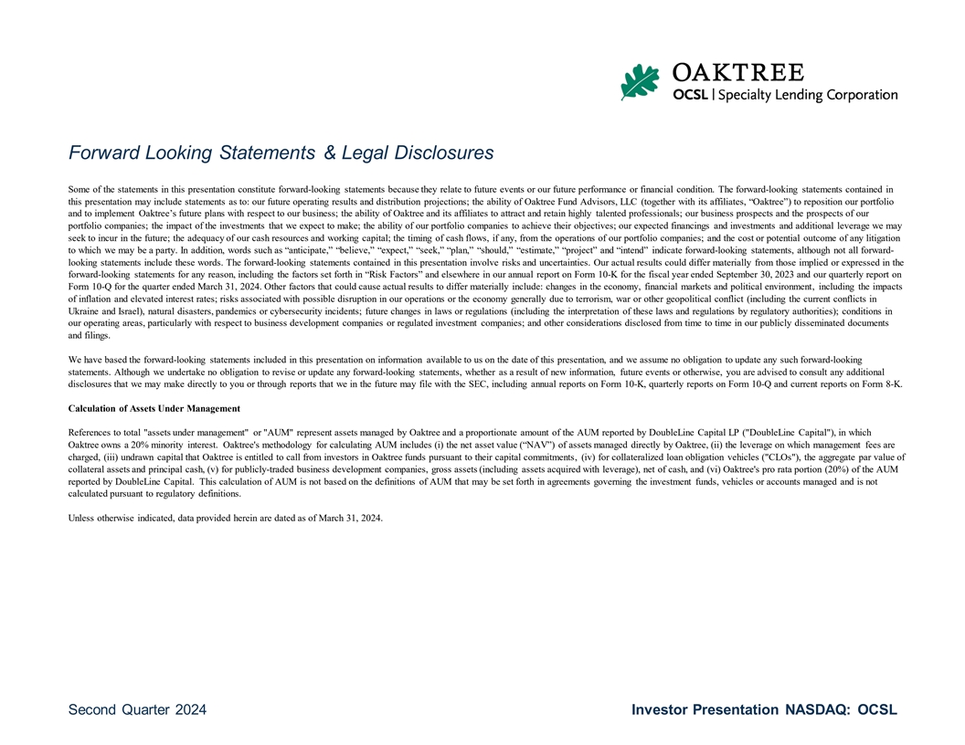 Forward Looking Statements & Legal Disclosures Some of the statements in this presentation constitute forward-looking statements because they relate to future events or our future performance or financial condition. The forward-looking statements contained in this presentation may include statements as to: our future operating results and distribution projections; the ability of Oaktree Fund Advisors, LLC (together with its affiliates, “Oaktree”) to reposition our portfolio and to implement Oaktree’s future plans with respect to our business; the ability of Oaktree and its affiliates to attract and retain highly talented professionals; our business prospects and the prospects of our portfolio companies; the impact of the investments that we expect to make; the ability of our portfolio companies to achieve their objectives; our expected financings and investments and additional leverage we may seek to incur in the future; the adequacy of our cash resources and working capital; the timing of cash flows, if any, from the operations of our portfolio companies; and the cost or potential outcome of any litigation to which we may be a party. In addition, words such as “anticipate,” “believe,” “expect,” “seek,” “plan,” “should,” “estimate,” “project” and “intend” indicate forward-looking statements, although not all forward- looking statements include these words. The forward-looking statements contained in this presentation involve risks and uncertainties. Our actual results could differ materially from those implied or expressed in the forward-looking statements for any reason, including the factors set forth in “Risk Factors” and elsewhere in our annual report on Form 10-K for the fiscal year ended September 30, 2023 and our quarterly report on Form 10-Q for the quarter ended March 31, 2024. Other factors that could cause actual results to differ materially include: changes in the economy, financial markets and political environment, including the impacts of inflation and elevated interest rates; risks associated with possible disruption in our operations or the economy generally due to terrorism, war or other geopolitical conflict (including the current conflicts in Ukraine and Israel), natural disasters, pandemics or cybersecurity incidents; future changes in laws or regulations (including the interpretation of these laws and regulations by regulatory authorities); conditions in our operating areas, particularly with respect to business development companies or regulated investment companies; and other considerations disclosed from time to time in our publicly disseminated documents and filings. We have based the forward-looking statements included in this presentation on information available to us on the date of this presentation, and we assume no obligation to update any such forward-looking statements. Although we undertake no obligation to revise or update any forward-looking statements, whether as a result of new information, future events or otherwise, you are advised to consult any additional disclosures that we may make directly to you or through reports that we in the future may file with the SEC, including annual reports on Form 10-K, quarterly reports on Form 10-Q and current reports on Form 8-K. Calculation of Assets Under Management References to total assets under management or AUM represent assets managed by Oaktree and a proportionate amount of the AUM reported by DoubleLine Capital LP ( DoubleLine Capital ), in which Oaktree owns a 20% minority interest. Oaktree's methodology for calculating AUM includes (i) the net asset value (“NAV”) of assets managed directly by Oaktree, (ii) the leverage on which management fees are charged, (iii) undrawn capital that Oaktree is entitled to call from investors in Oaktree funds pursuant to their capital commitments, (iv) for collateralized loan obligation vehicles ( CLOs ), the aggregate par value of collateral assets and principal cash, (v) for publicly-traded business development companies, gross assets (including assets acquired with leverage), net of cash, and (vi) Oaktree's pro rata portion (20%) of the AUM reported by DoubleLine Capital. This calculation of AUM is not based on the definitions of AUM that may be set forth in agreements governing the investment funds, vehicles or accounts managed and is not calculated pursuant to regulatory definitions. Unless otherwise indicated, data provided herein are dated as of March 31, 2024. Second Quarter 2024 Investor Presentation NASDAQ: OCSL