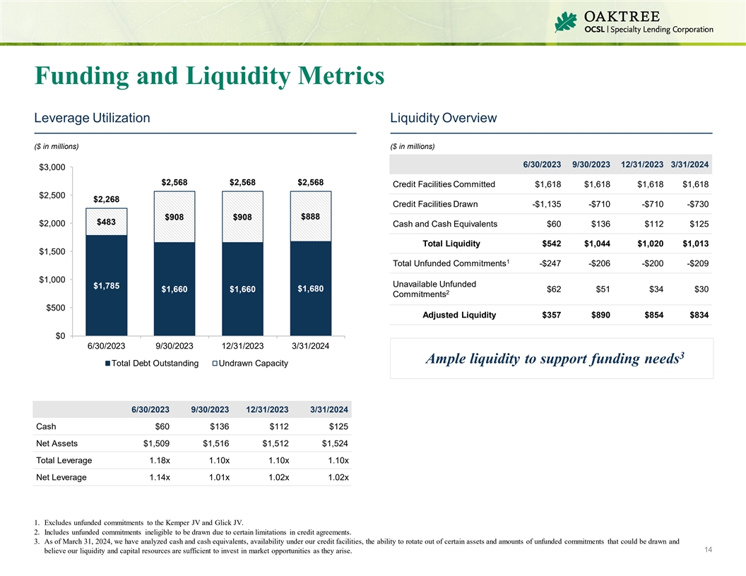 Capital Structure Overview Funding Sources ($ in millions) 0.90x to 1.25x Principal Target Leverage Ratio Committed Outstanding Interest Rate Maturity Syndicated Credit Facility $1,218 $450 SOFR + 2.00% 6/23/2028 1 Citibank Facility $400 $280 SOFR + 2.00%-2.75% 1/26/2027 2025 Notes $300 $300 3.500% 2/25/2025 Investment 2 2027 Notes $350 $350 2.700% (SOFR + 1.658%) 1/15/2027 Grade Rated 3 2029 Notes $300 $300 7.100% (SOFR + 3.126%) 2/15/2029 By Moody’s And Fitch Cash and Cash Equivalents $-- -$125 -- -- Total $2,568 $1,555 Weighted Average Interest Rate 7.0% Net Debt to Equity Ratio 1.02x 57% Unsecured Borrowings Maturities ($ in millions) $1,500 $1,000 $120 $768 $1.0bn $500 $280 4 $450 $300 $350 $300 Available Liquidity $0 2024 2025 2026 2027 2028 2029 Unsecured Debt Credit Facilities Drawn Credit Facilities Undrawn Diverse and flexible sources of debt capital with ample liquidity As of March 31, 2024 Note: Numbers may not sum due to rounding. 1. The interest rate on outstanding borrowings is SOFR plus 2.00% on broadly syndicated loans and SOFR plus 2.75% on all other eligible loans. 2. The Company entered into an interest rate swap agreement under which the Company receives a fixed interest rate of 2.700% and pays a floating rate of the three-month SOFR plus 1.658% on a notional amount of $350 million. 3. The Company entered into an interest rate swap agreement under which the Company receives a fixed interest rate of 7.100% and pays a floating rate of the three-month SOFR plus 3.126% on a notional amount of $300 million 4. Liquidity was composed of $125.0 million of unrestricted cash and cash equivalents and $888.0 million of undrawn capacity under the credit facilities (subject to borrowing base and other limitations). 13