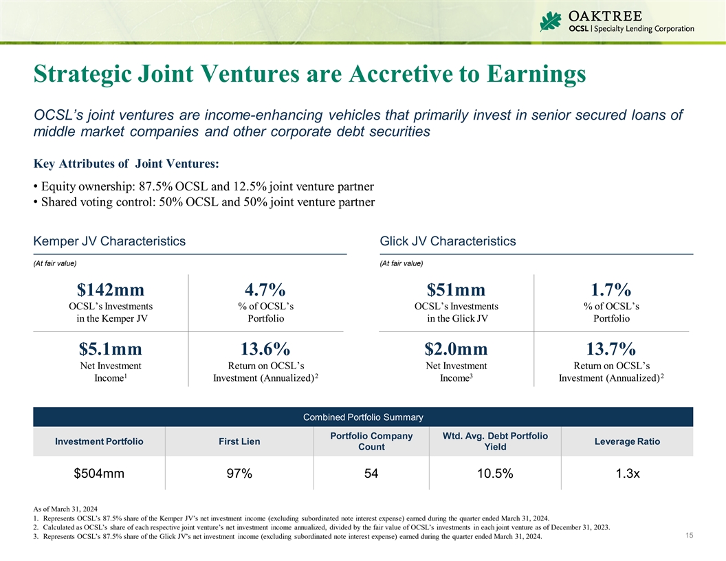 Funding and Liquidity Metrics Leverage Utilization Liquidity Overview ($ in millions) ($ in millions) 6/30/2023 9/30/2023 12/31/2023 3/31/2024 $3,000 $2,568 $2,568 $2,568 Credit Facilities Committed $1,618 $1,618 $1,618 $1,618 $2,500 $2,268 Credit Facilities Drawn -$1,135 -$710 -$710 -$730 $888 $908 $908 $483 $2,000 Cash and Cash Equivalents $60 $136 $112 $125 Total Liquidity $542 $1,044 $1,020 $1,013 $1,500 1 Total Unfunded Commitments -$247 -$206 -$200 -$209 $1,000 Unavailable Unfunded $1,785 $1,680 $1,660 $1,660 $62 $51 $34 $30 2 Commitments $500 Adjusted Liquidity $357 $890 $854 $834 $0 6/30/2023 9/30/2023 12/31/2023 3/31/2024 3 Ample liquidity to support funding needs Total Debt Outstanding Undrawn Capacity 6/30/2023 9/30/2023 12/31/2023 3/31/2024 Cash $60 $136 $112 $125 Net Assets $1,509 $1,516 $1,512 $1,524 Total Leverage 1.18x 1.10x 1.10x 1.10x Net Leverage 1.14x 1.01x 1.02x 1.02x 1. Excludes unfunded commitments to the Kemper JV and Glick JV. 2. Includes unfunded commitments ineligible to be drawn due to certain limitations in credit agreements. 3. As of March 31, 2024, we have analyzed cash and cash equivalents, availability under our credit facilities, the ability to rotate out of certain assets and amounts of unfunded commitments that could be drawn and 14 believe our liquidity and capital resources are sufficient to invest in market opportunities as they arise.