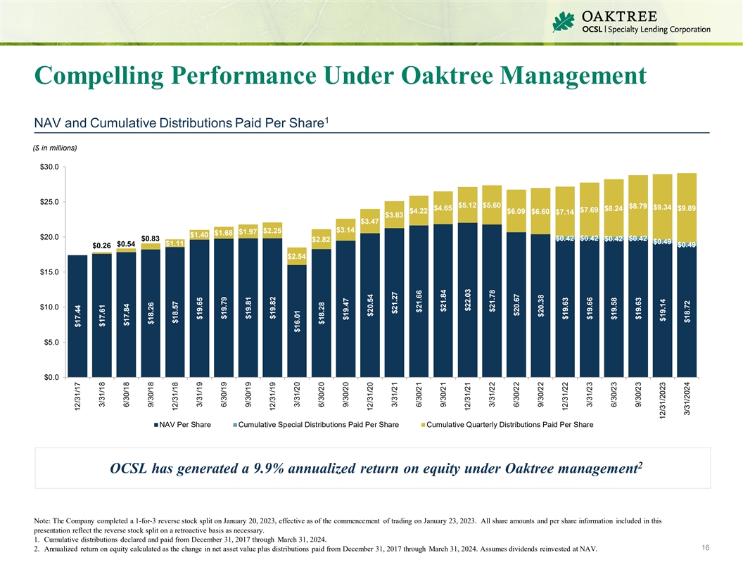 Strategic Joint Ventures are Accretive to Earnings OCSL’s joint ventures are income-enhancing vehicles that primarily invest in senior secured loans of middle market companies and other corporate debt securities Key Attributes of Joint Ventures: • Equity ownership: 87.5% OCSL and 12.5% joint venture partner • Shared voting control: 50% OCSL and 50% joint venture partner Kemper JV Characteristics Glick JV Characteristics (At fair value) (At fair value) $142mm 4.7% $51mm 1.7% OCSL’s Investments % of OCSL’s OCSL’s Investments % of OCSL’s in the Kemper JV Portfolio in the Glick JV Portfolio $5.1mm 13.6% $2.0mm 13.7% Net Investment Return on OCSL’s Net Investment Return on OCSL’s 1 2 3 2 Income Investment (Annualized) Income Investment (Annualized) Combined Portfolio Summary Portfolio Company Wtd. Avg. Debt Portfolio Investment Portfolio First Lien Leverage Ratio Count Yield $504mm 97% 54 10.5% 1.3x As of March 31, 2024 1. Represents OCSL’s 87.5% share of the Kemper JV’s net investment income (excluding subordinated note interest expense) earned during the quarter ended March 31, 2024. 2. Calculated as OCSL’s share of each respective joint venture’s net investment income annualized, divided by the fair value of OCSL’s investments in each joint venture as of December 31, 2023. 15 3. Represents OCSL’s 87.5% share of the Glick JV’s net investment income (excluding subordinated note interest expense) earned during the quarter ended March 31, 2024.