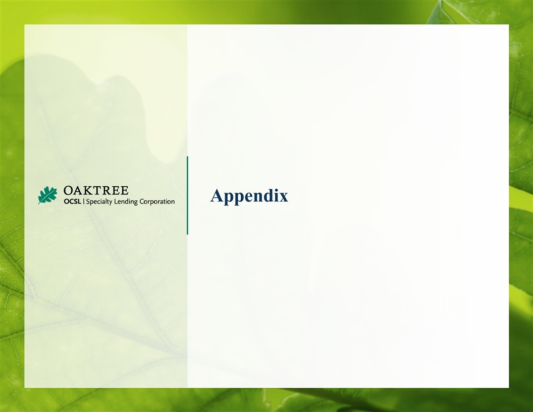 Compelling Performance Under Oaktree Management 1 NAV and Cumulative Distributions Paid Per Share ($ in millions) $30.0 $25.0 $5.12 $5.60 $8.79 $9.34 $4.65 $8.24 $9.89 $7.69 $4.22 $6.09 $6.60 $7.14 $3.83 $3.47 $3.14 $2.25 $1.97 $1.68 $1.40 $20.0 $0.83 $0.42 $0.42 $0.42 $2.82 $0.42 $0.49 $0.54 $1.11 $0.49 $0.26 $2.54 $15.0 $10.0 $5.0 $0.0 NAV Per Share Cumulative Special Distributions Paid Per Share Cumulative Quarterly Distributions Paid Per Share 2 OCSL has generated a 9.9% annualized return on equity under Oaktree management Note: The Company completed a 1-for-3 reverse stock split on January 20, 2023, effective as of the commencement of trading on January 23, 2023. All share amounts and per share information included in this presentation reflect the reverse stock split on a retroactive basis as necessary. 1. Cumulative distributions declared and paid from December 31, 2017 through March 31, 2024. 16 2. Annualized return on equity calculated as the change in net asset value plus distributions paid from December 31, 2017 through March 31, 2024. Assumes dividends reinvested at NAV. 12/31/17 $17.44 3/31/18 $17.61 6/30/18 $17.84 9/30/18 $18.26 12/31/18 $18.57 3/31/19 $19.65 6/30/19 $19.79 9/30/19 $19.81 12/31/19 $19.82 3/31/20 $16.01 6/30/20 $18.28 9/30/20 $19.47 12/31/20 $20.54 3/31/21 $21.27 6/30/21 $21.66 9/30/21 $21.84 12/31/21 $22.03 3/31/22 $21.78 6/30/22 $20.67 9/30/22 $20.38 12/31/22 $19.63 3/31/23 $19.66 6/30/23 $19.58 9/30/23 $19.63 12/31/2023 $19.14 3/31/2024 $18.72