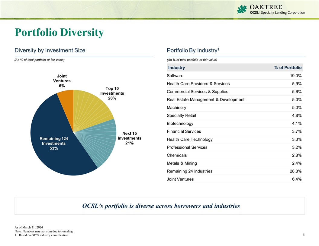Portfolio Summary Portfolio Characteristics Portfolio Composition (At fair value) (As % of total portfolio at fair value; $ in millions) 3% 6% 5% First Lien – $2,463 5% $3.0bn 151 Second Lien – $166 Unsecured Debt – $78 Total Investments Portfolio Companies Equity – $146 Joint Ventures – $194 81% 12.2% $134mm 2,3 Top Ten Sub-industries Weighted Average Yield on Median Debt Portfolio (As % of total portfolio at fair value) 1 Debt Investments Company EBITDA Application Software 17.5% Biotechnology 4.1% Industrial Machinery & Sup. & Cmpnts. 4.1% Health Care Services 3.9% Health Care Technology 3.4% 86% 85% Data Processing & Outsourced Services 3.0% Real Estate Operating Companies 2.7% Senior Secured Floating Rate Pharmaceuticals 2.3% Debt Investments Diversified Support Services 2.2% Interactive Media & Services 2.2% As of March 31, 2024 Note: Numbers may not sum due to rounding. 1. Excludes investments in negative EBITDA borrowers, royalty interest financings, structured products and recurring revenue software businesses. 2. Based on GICS sub-industry classification. 3. Excludes multi-sector holdings, which is primarily composed of investments in Senior Loan Fund JV I LLC (the “Kemper JV”) and OCSI Glick JV (the “Glick JV”), joint ventures that invest primarily in senior 4 secured loans of middle market companies.