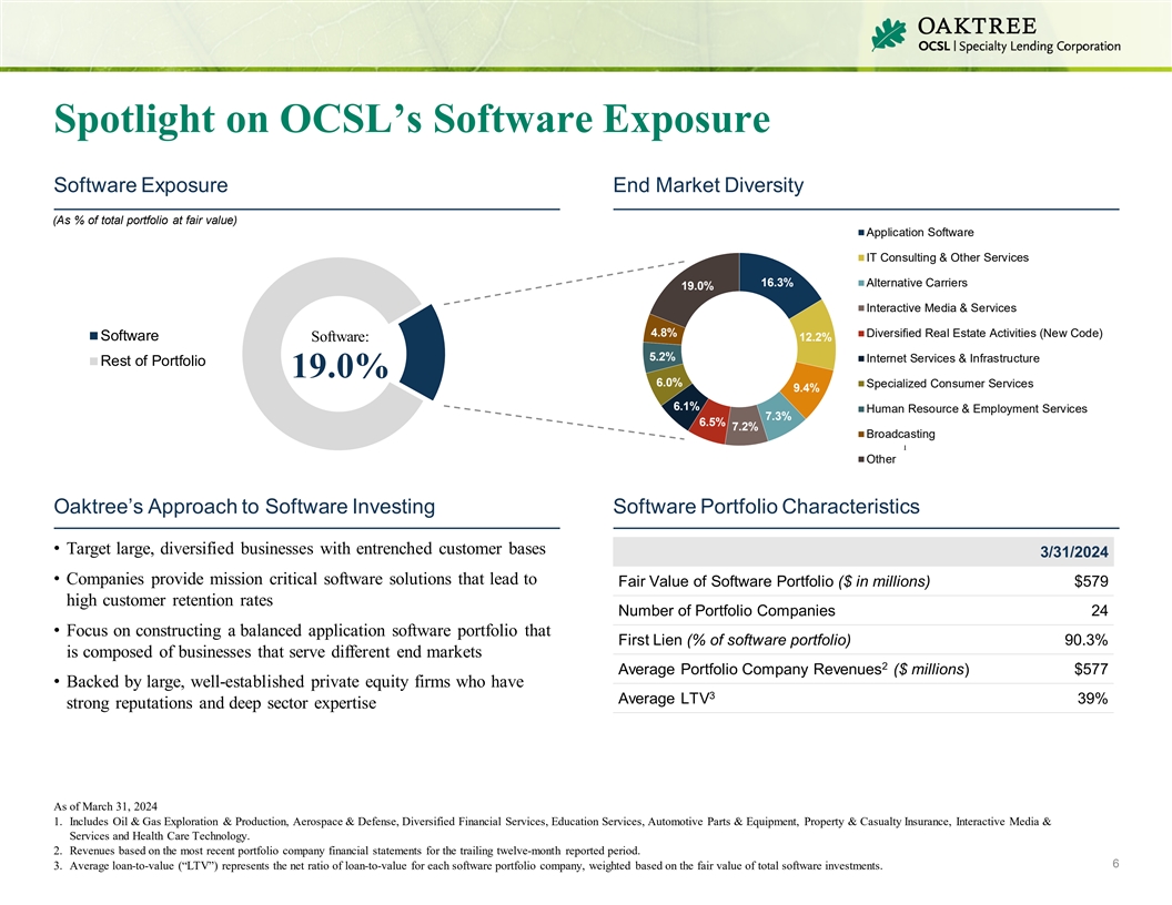 Portfolio Diversity 1 Diversity by Investment Size Portfolio By Industry (As % of total portfolio at fair value) (As % of total portfolio at fair value) Industry % of Portfolio Software 19.0% Joint Ventures Health Care Providers & Services 5.9% 6% Top 10 Commercial Services & Supplies 5.6% Investments 20% Real Estate Management & Development 5.0% Machinery 5.0% Specialty Retail 4.8% Biotechnology 4.1% Financial Services 3.7% Next 15 Investments Remaining 124 Health Care Technology 3.3% Investments 21% Professional Services 3.2% 53% Chemicals 2.8% Metals & Mining 2.4% Remaining 24 Industries 28.8% Joint Ventures 6.4% OCSL’s portfolio is diverse across borrowers and industries As of March 31, 2024 Note: Numbers may not sum due to rounding. 5 1. Based on GICS industry classification.